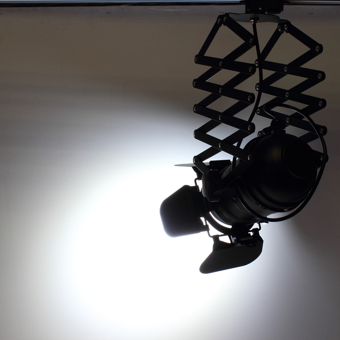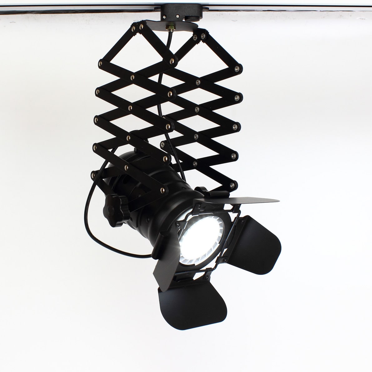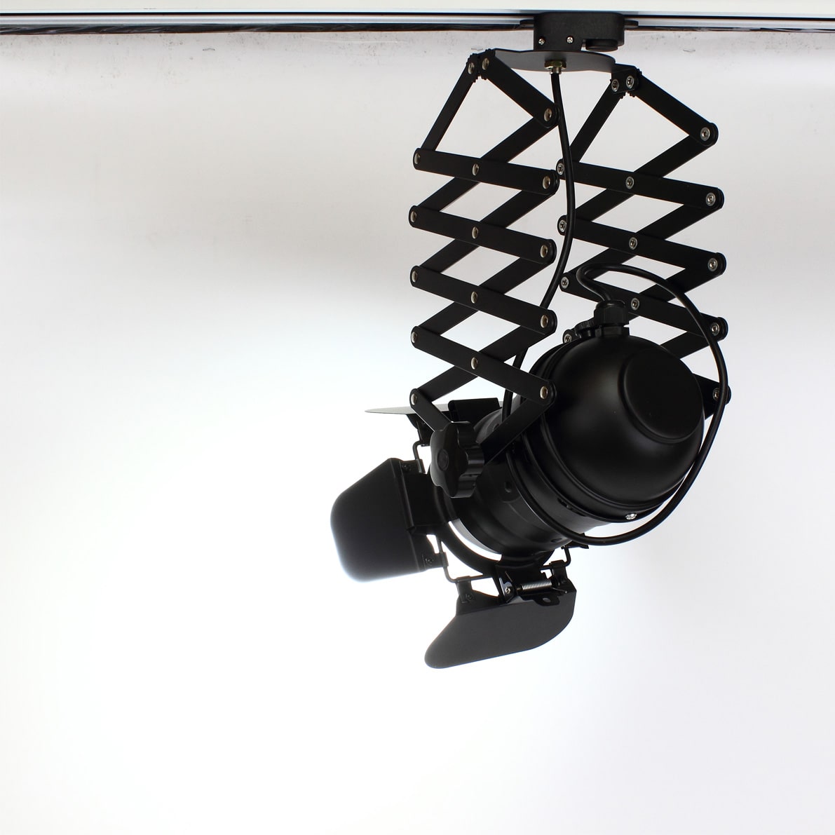 Светодиодный трековый светильник типа soffit. Черный корпус. Цоколь Е27. Напряжение 85-265V, мощность 40W, цвет свечения белый 6000K, световой поток 4000Lm. Угол свечения 15 градусов. Класс защиты IP40. Размеры 200x200x400мм. Максимальная регулируемая высота подвеса 800мм. Вес 2400г.