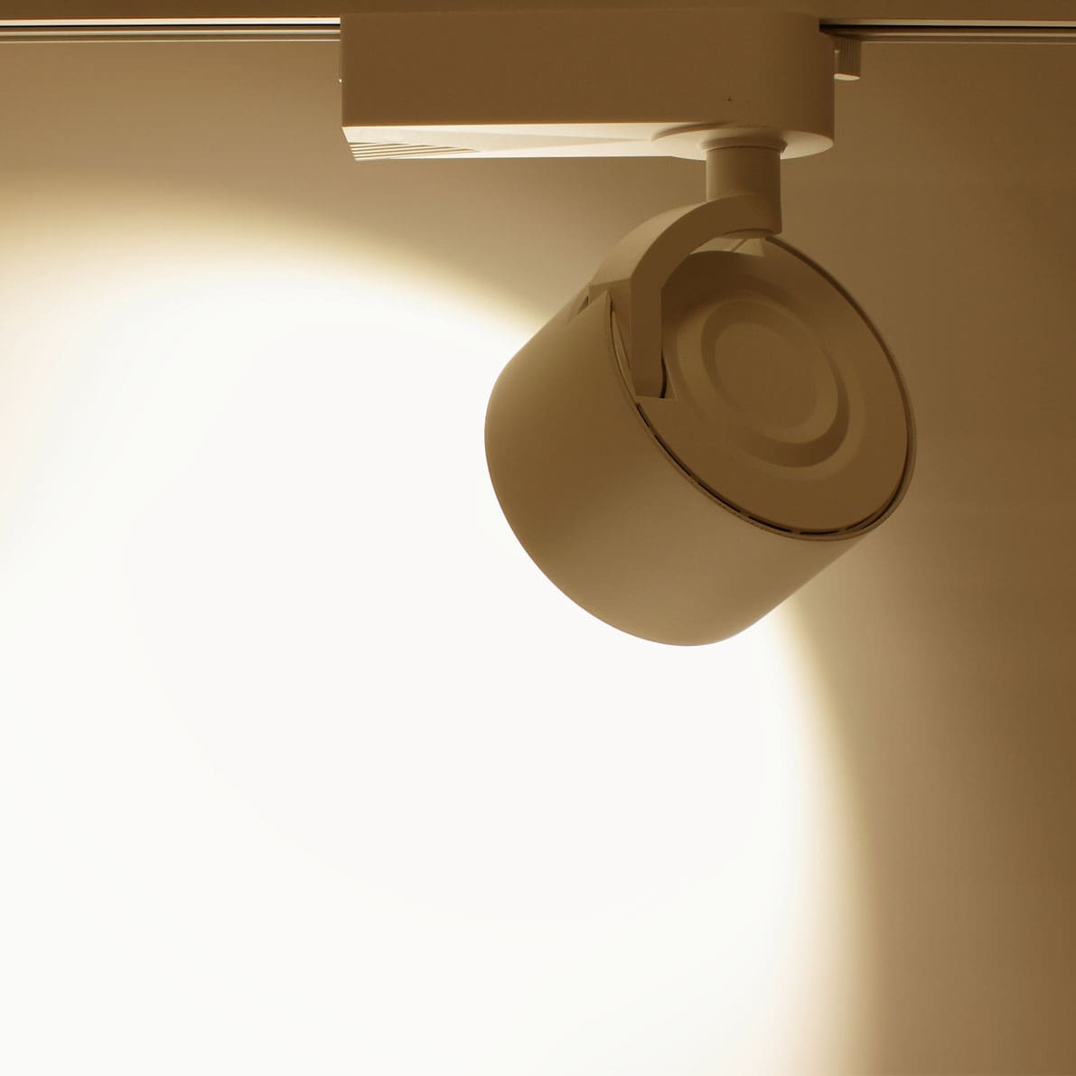 Светодиодный трековый светильник. Стильный белый корпус. Напряжение 85-265V, мощность 30W, цвет свечения теплый белый 3000-3500K, световой поток 3000Lm. Угол свечения 30 градусов. Класс защиты IP40. Размеры 180x122x180мм. Вес 750г