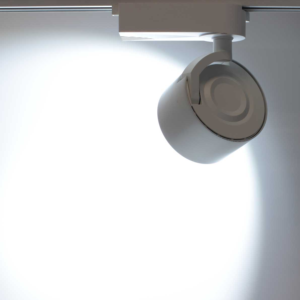 Светодиодный трековый светильник. Стильный белый корпус. Напряжение 85-265V, мощность 30W, цвет свечения белый 6000-6500K, световой поток 3000Lm. Угол свечения 30 градусов. Класс защиты IP40. Размеры 180x122x180мм. Вес 750г