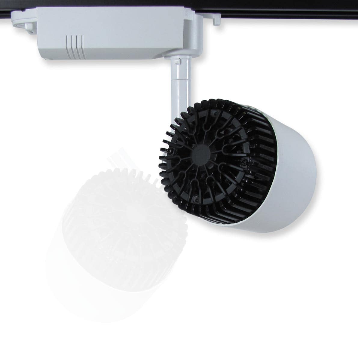 Трековый светильник. Белый+черный корпус. Технология COB. Напряжение 220V, мощность 30W, цвет свечения теплый белый 3000K, световой поток 3600-4050Lm..Класс защиты IP40. Срок службы 30000 часов. Размеры 160x100x190мм.
