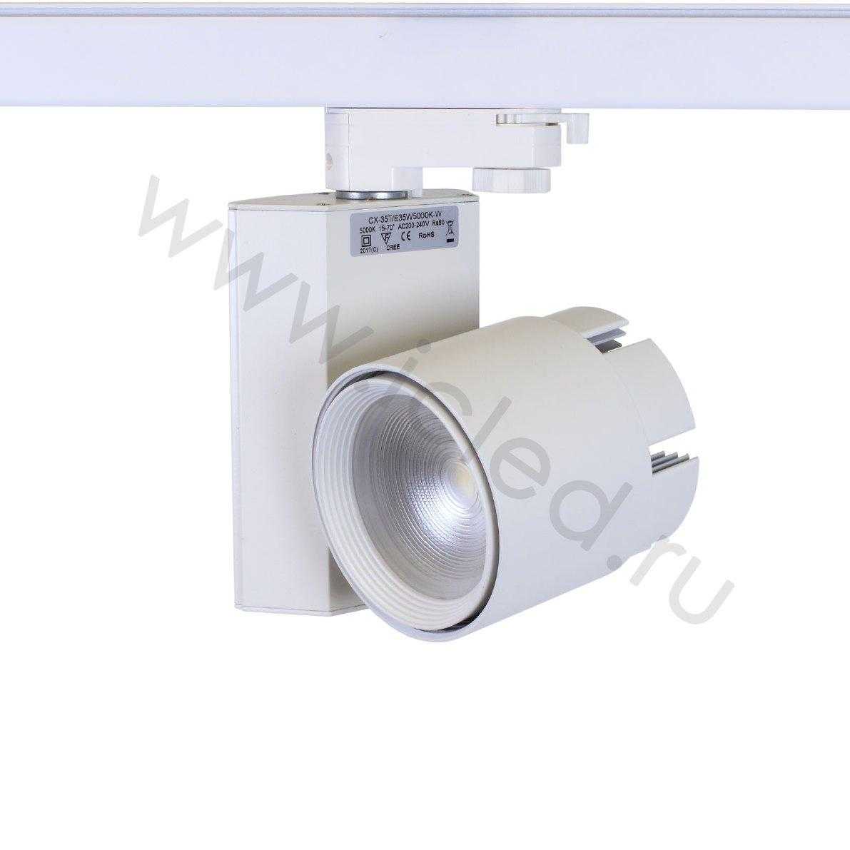 Трековый светильник. Белый корпус. Используется COB матрица CREE. Напряжение 200-240V, мощность 35W, цвет свечения белый 5000K, световой поток 3150Lm. Регулируемый угол свечения 15-70 градусов. Класс защиты IP40. Коэффициент пульсаций 0,9%. Коэффициент мощности 0,96. Устанавливается на четырехпроводной шинопровод. Возможность подключения до трех групп светильников на одном трековом шинопроводе. Размеры 130x150x210мм. Вес 1200гр.