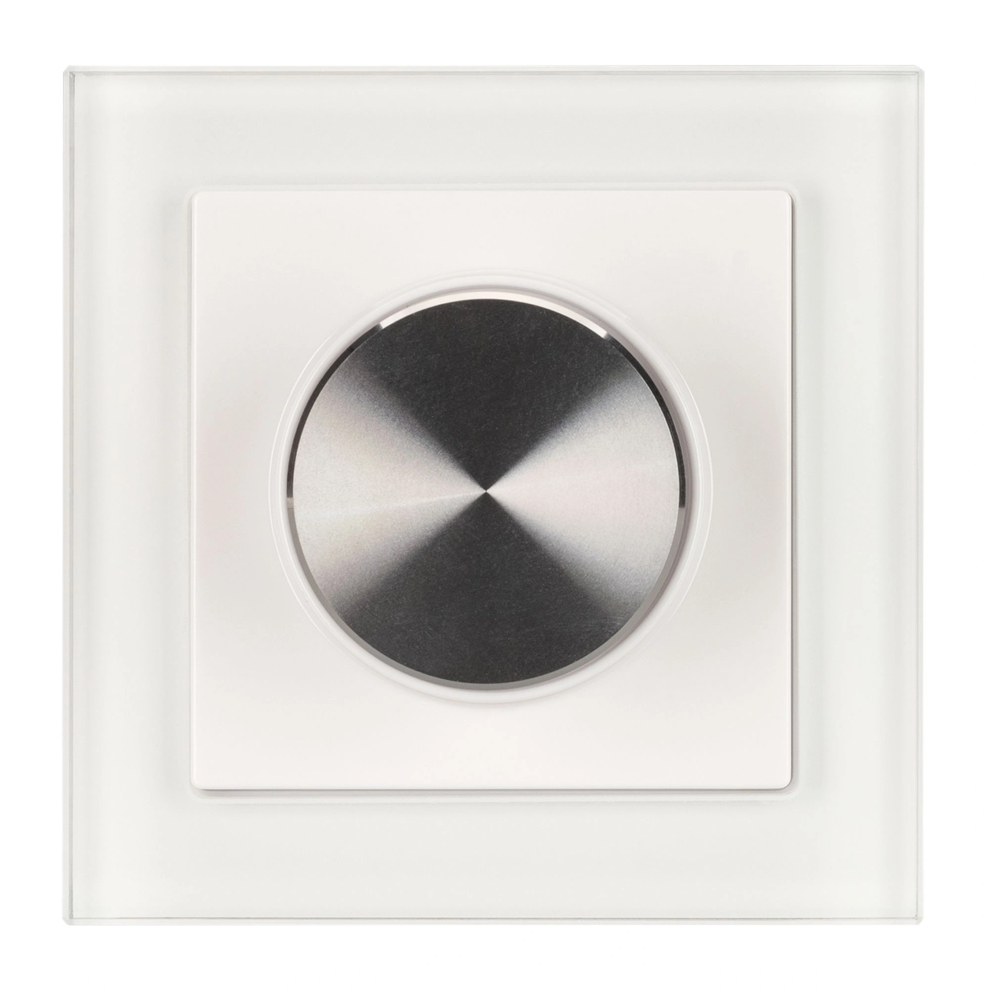 Встраиваемая стеклянная панель белого цвета с роторным вращателем (потенциометром), предназначенная для управления светодиодным или любым другим осветительным оборудованием, работающим в протоколе DALI. С помощью панели осуществляется регулировка яркости и включение/выключение света. Панель совместима с любыми исполнительными устройствами стандарта DALI. Установка номера группы или режима Broadcast выполняется переключателем на задней стороне панели. Питание устройства осуществляется от шины DALI, тип устройства DALI DT6. Установка адреса управления выполняется переключателями на корпусе. Габариты устройства составляют 80х80х30 мм, подсветка регулятора во включенном состоянии, установка в стандартный подрозетник. Панель совместима с декоративными рамками ведущих мировых производителей (GIRA, JUNG, BERKER, MERTEN).