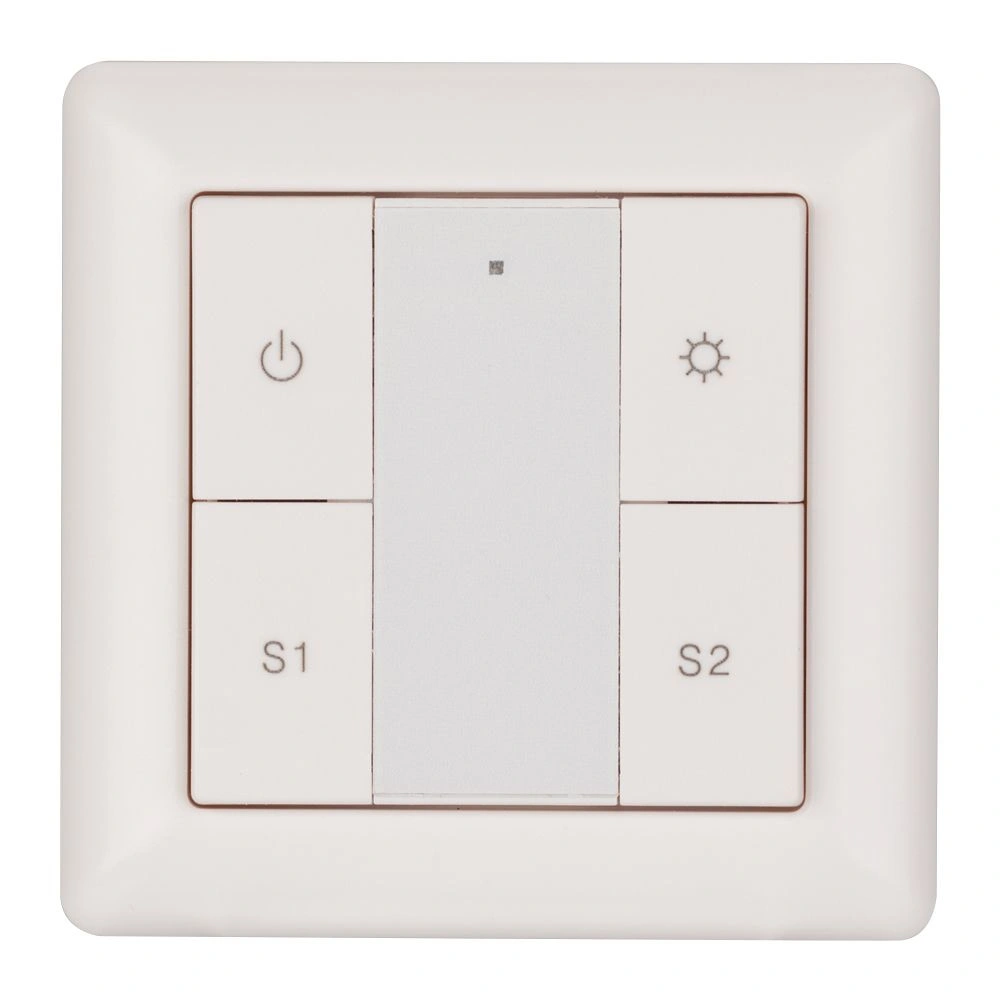 Встраиваемая пластиковая панель белого цвета с кнопочным управлением, предназначенная для управления одноцветными светодиодными лентами, светильниками и другими источниками света в системах управления светом DALI. Позволяет включать/выключать свет в одной группе, менять его яркость, сохранять и вызывать до 2 световых сцен. Установка номера группы и сцен выполняется переключателями на задней стороне панели. Устройство совместимо с диммерами стандарта DALI. Передача команд от панели к диммерам выполняется по общей двухпроводной шине DALI. Удобное и точное управление при помощи отдельных механических кнопок для каждой функции. Питание от шины DALI. Габариты устройства составляют 71.2х71.2х13.6 мм. Панель совместима с декоративными рамками ведущих мировых производителей (GIRA, JUNG, BERKER, MERTEN).