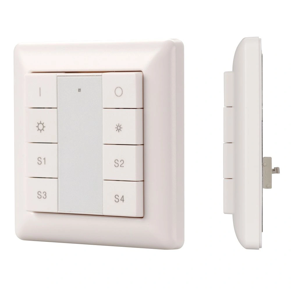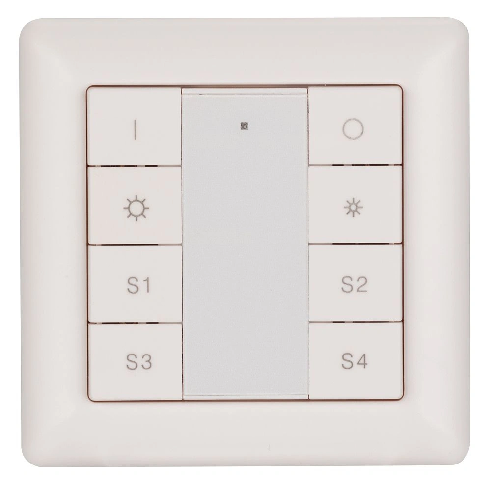 Встраиваемая пластиковая панель белого цвета с кнопочным управлением, предназначенная для управления одноцветными светодиодными лентами, светильниками и другими источниками света в системах управления светом DALI. Позволяет включать/выключать свет в одной группе, менять его яркость, сохранять и вызывать до 4 световых сцен. Установка номера группы и сцен выполняется переключателями на задней стороне панели. Устройство совместимо с диммерами стандарта DALI. Передача команд от панели к диммерам выполняется по общей двухпроводной шине DALI. Удобное и точное управление при помощи отдельных механических кнопок для каждой функции. Питание от шины DALI. Габариты устройства составляют 71.2х71.2х13.6 мм. Панель совместима с декоративными рамками ведущих мировых производителей (GIRA, JUNG, BERKER, MERTEN).