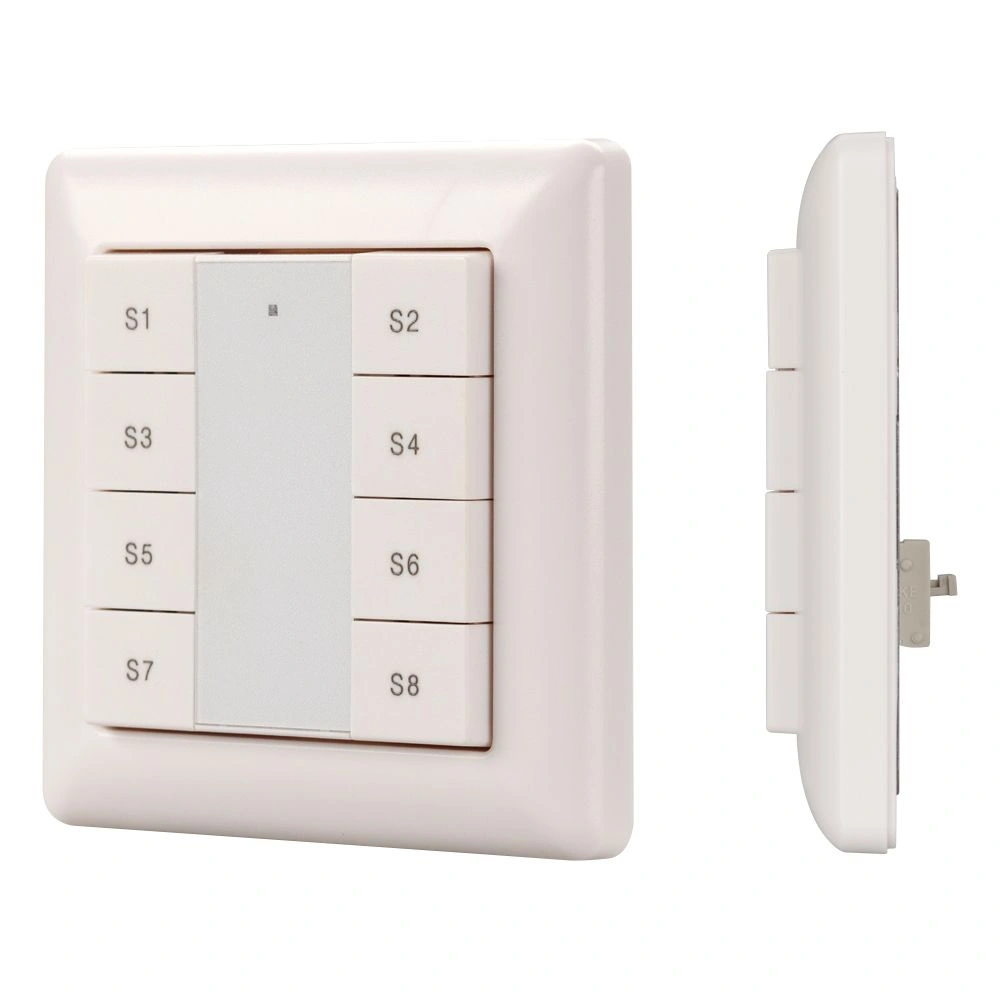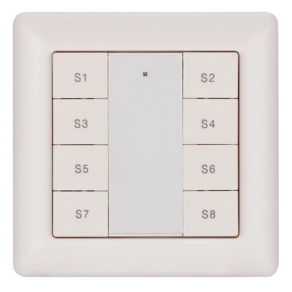 Встраиваемая пластиковая панель белого цвета с кнопочным управлением, предназначенная для включения и выключения световых сцен в системах управления светом DALI. Позволяет включать/выключать световые сцены в одной группе или для всех подключенных исполнительных устройств (Broadcast). Установка номера группы и сцен выполняется переключателями на задней стороне панели. Поддерживает управление 8 сценами. Устройство совместимо с диммерами стандарта DALI. Передача команд от панели к диммерам выполняется по общей двухпроводной шине DALI. Удобное и точное управление при помощи отдельных механических кнопок для каждой функции. Питание от шины DALI. Габариты устройства составляют 71.2х71.2х13.6 мм, установка в стандартную монтажную коробку. Панель совместима с декоративными рамками ведущих мировых производителей (GIRA, JUNG, BERKER, MERTEN).