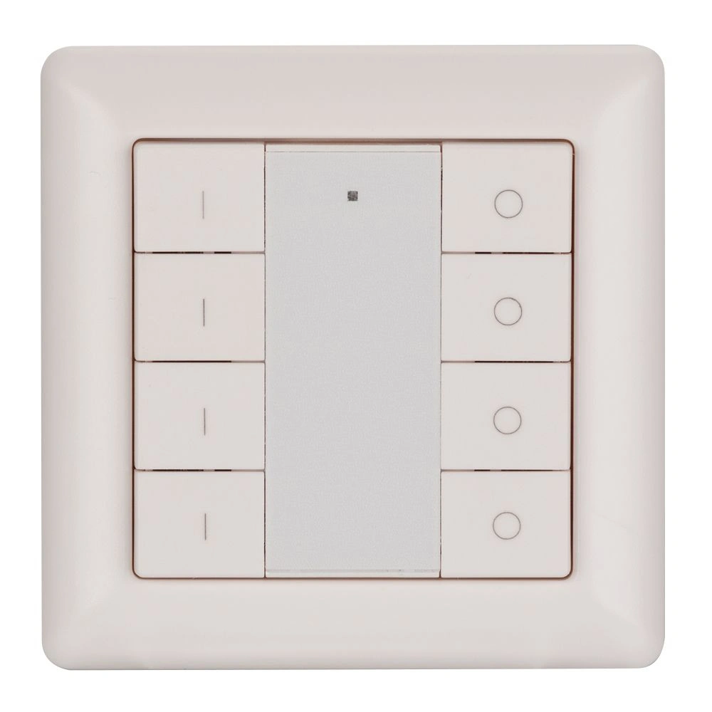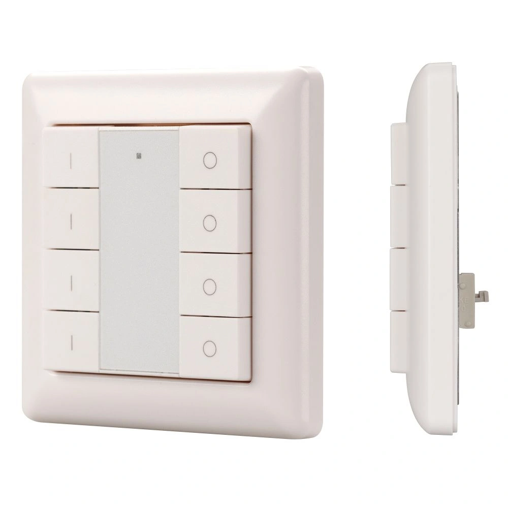 Встраиваемая пластиковая панель белого цвета с кнопочным управлением, предназначенная для управления одноцветными светодиодными лентами, светильниками и другими источниками света в системах управления светом DALI. Позволяет включать/выключать свет и менять его яркость в 4 группах либо в режиме широковещателя (Broadcast). Установка номера группы и сцен выполняется переключателями на задней стороне панели. Устройство совместимо с диммерами стандарта DALI. Передача команд от панели к диммерам выполняется по общей двухпроводной шине DALI. Удобное и точное управление при помощи отдельных механических кнопок для каждой функции. Питание от шины DALI. Габариты устройства составляют 71.2х71.2х13.6 мм. Панель совместима с декоративными рамками ведущих мировых производителей (GIRA, JUNG, BERKER, MERTEN).