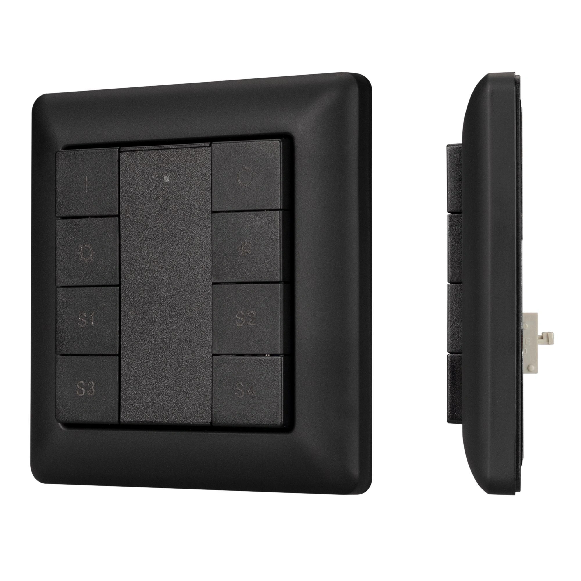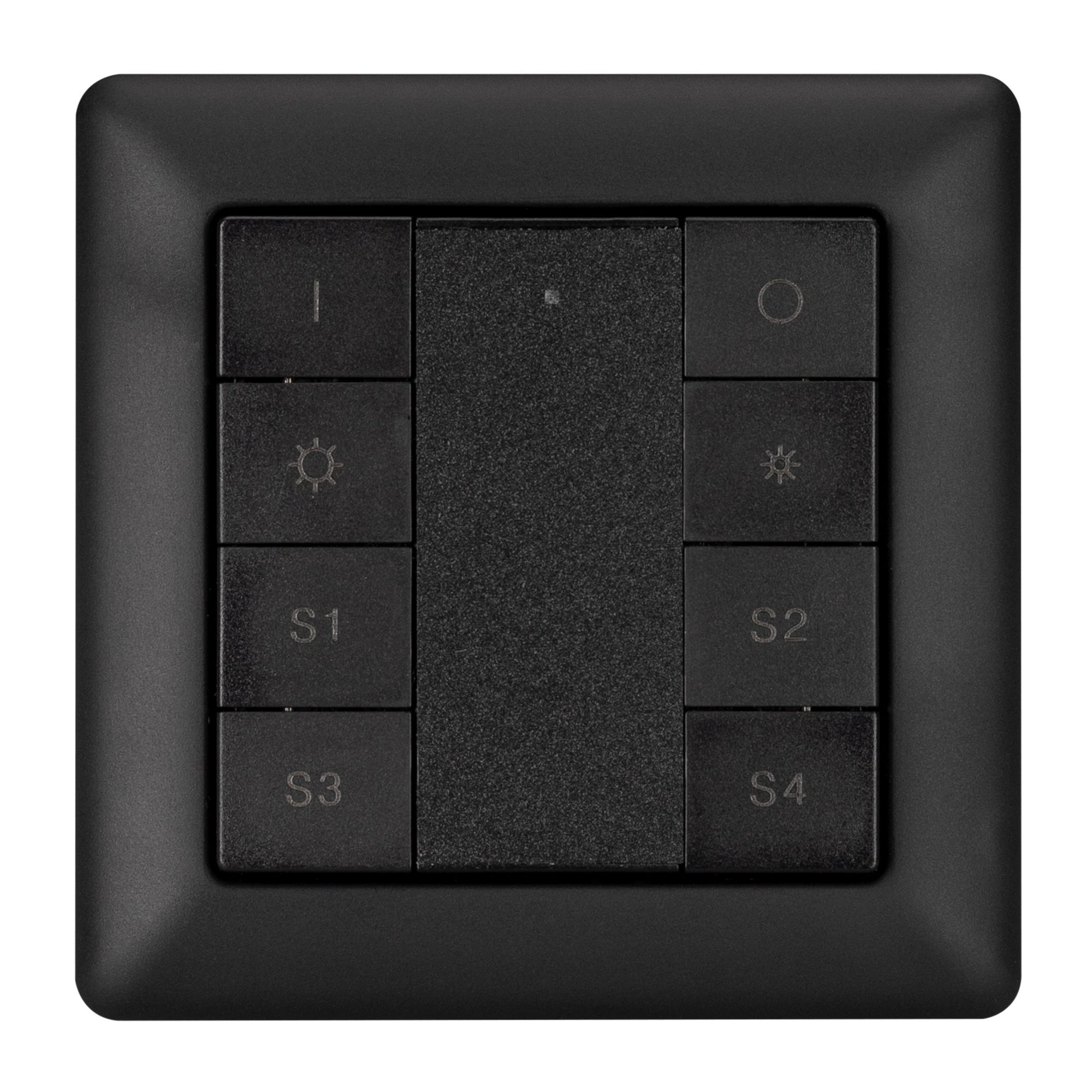 Встраиваемая пластиковая панель чёрного цвета с кнопочным управлением, предназначенная для управления одноцветными светодиодными лентами, светильниками и другими источниками света в системах управления светом DALI. Позволяет включать/выключать свет в одной группе, менять его яркость, сохранять и вызывать до 4 световых сцен. Установка номера группы и сцен выполняется переключателями на задней стороне панели. Устройство совместимо с диммерами стандарта DALI. Передача команд от панели к диммерам выполняется по общей двухпроводной шине DALI. Удобное и точное управление при помощи отдельных механических кнопок для каждой функции. Питание от шины DALI. Габариты устройства составляют 71.2х71.2х13.6 мм. Панель совместима с декоративными рамками ведущих мировых производителей (GIRA, JUNG, BERKER, MERTEN).