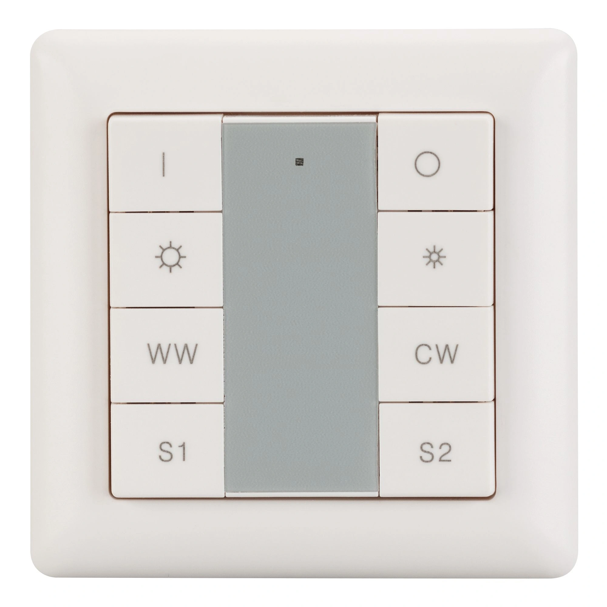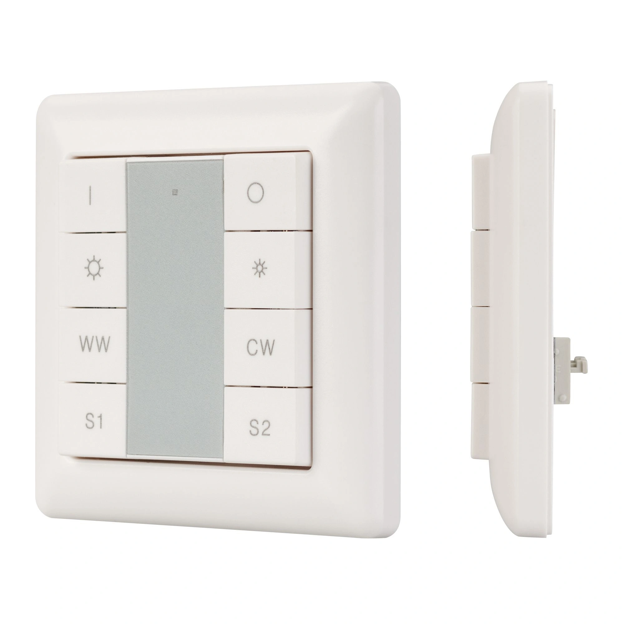 Встраиваемая пластиковая панель белого цвета с кнопочным управлением, предназначенная для управления мультибелымии MIX светодиодными лентами, светильниками и другими источниками света в системах управления светом DALI DT8. Позволяет включать/выключать свет, менять его яркость и управлять оттенком свечения белого цвета в 1 группе либо в режиме широковещателя (Broadcast). Сохранение и вызов 2 сцен. Установка номера группы и сцен выполняется переключателями на задней стороне панели. Устройство совместимо с диммерами стандарта DALI. Передача команд от панели к диммерам выполняется по общей двухпроводной шине DALI. Удобное и точное управление при помощи отдельных механических кнопок для каждой функции. Питание от шины DALI. Габариты устройства составляют 71.2х71.2х13.6 мм. Панель совместима с декоративными рамками ведущих мировых производителей (GIRA, JUNG, BERKER, MERTEN).