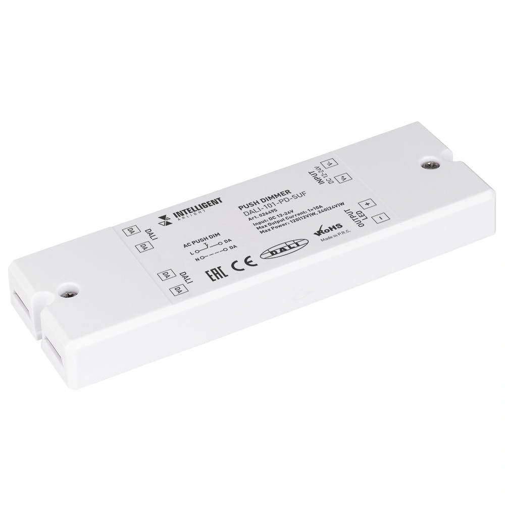1-канальный диммер для управления одноцветной светодиодной лентой в протоколе DALI. Устройство имеет входной сигнал DALI и совместимо со всеми блоками питания и панелями с выходом DALI марки Arlight и Intelligent Arlight. Питание диммера имеет диапазон напряжений от 12В до 24В, максимальный ток 10А на 1 канал, максимальная мощность 120-240Вт (в зависимости от напряжения питания). Габариты диммера составляют 145x46x16мм, корпус изготовлен из пластика белого цвета.