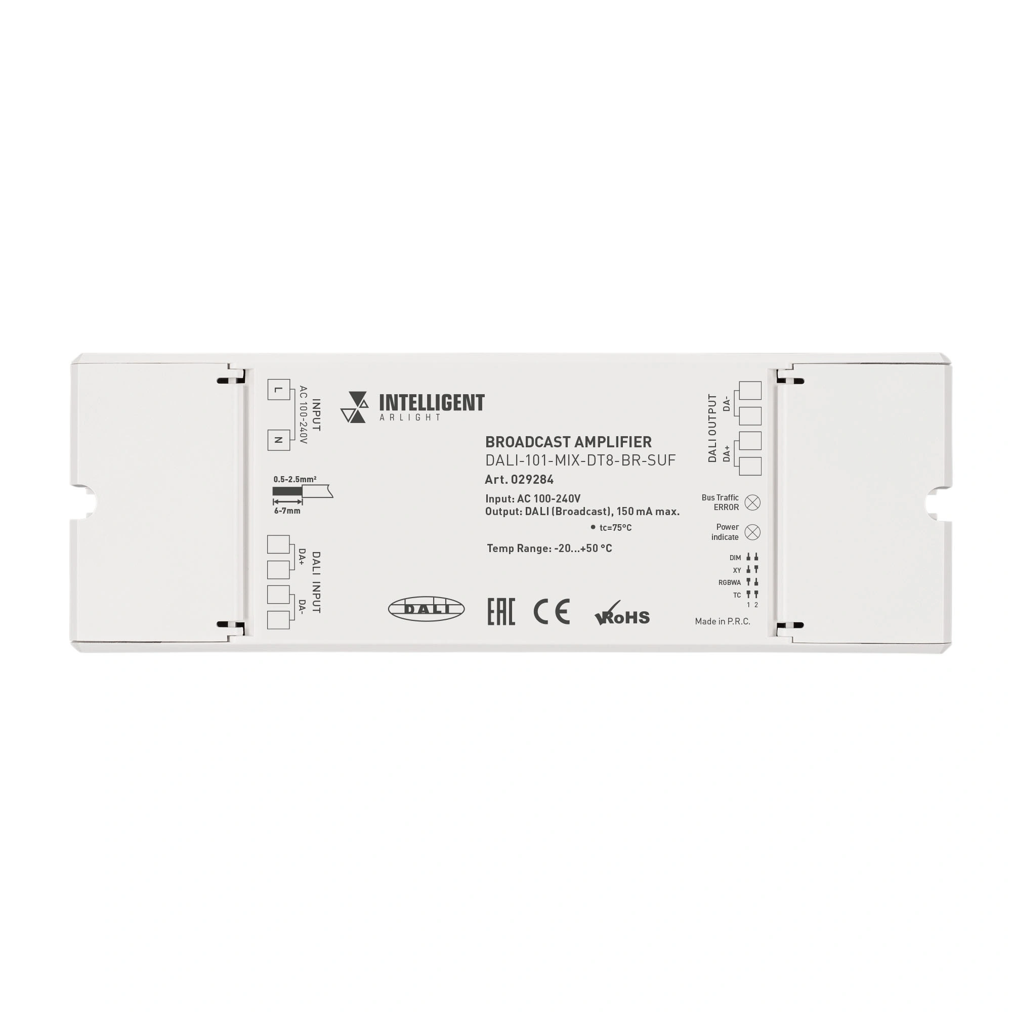 Усилитель (ретранслятор) сигнала DALI служит для трансляции команд с основной шины DALI на дополнительную в виде широковещательных команд (Broadcast), тем самым, увеличивая количество подключаемых устройств к шине DALI. Содержит встроенный источник питания, дополнительное питания после усилителя не требуется. На основной шине DALI занимает 1 адрес, адресация устройств на дополнительной линии DALI не требуется, т.к. все они управляются по адресу усилителя. Тип устройства DALI DT8 (управлением цветом MIX). Питание устройства от 230В. Габариты усилителя составляют 170x60x30 мм, корпус белого цвета.