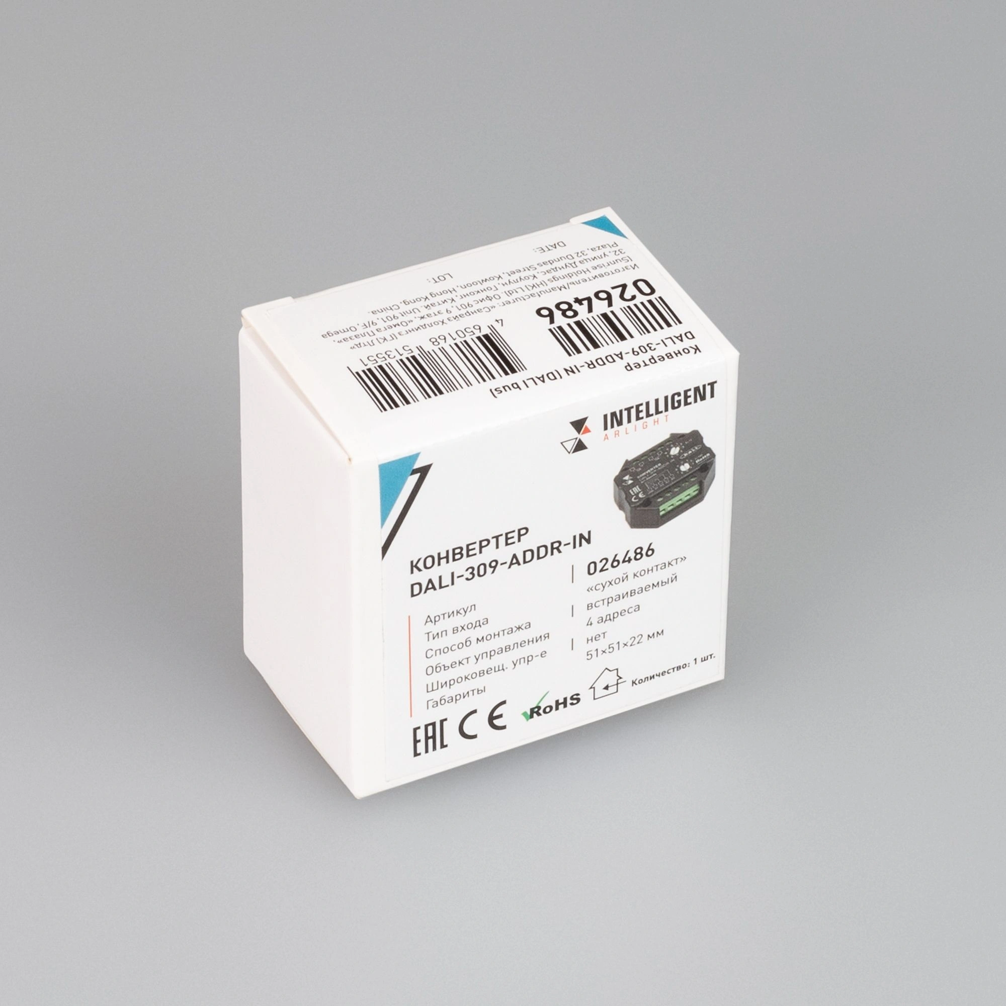 Конвертер сигнала от внешних выключателей в цифровой сигнал DALI. Входы - настраиваемые кнопки свободного функционала. Конвертер управляет 4 адресами при помощи диммеров DALI. Питание устройства от шины DALI, внешнее питание не требуется. Габариты конвертера составляют 51х51х22мм, корпус белого цвета, удобная установка в стандартную монтажную коробку.