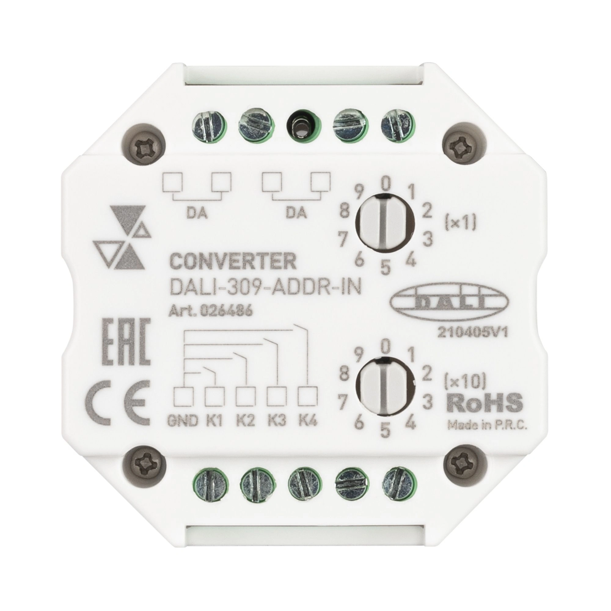 Управляется внешними настенными выключателями. Питание по шине DALI, выход - сигнал DALI, 4 адреса. Ручное выставление первого адреса. Размер 51х51х22 мм.