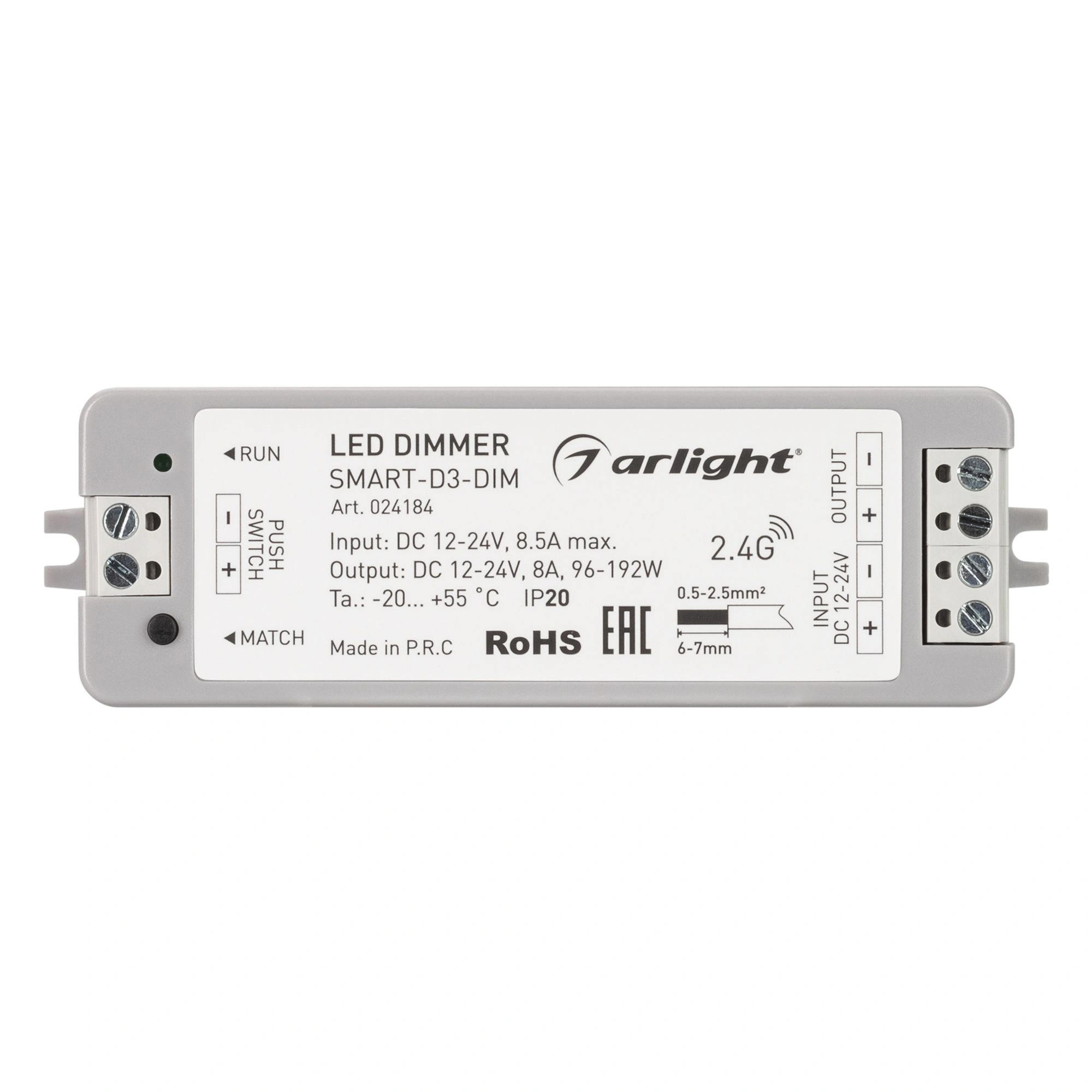 Диммер для управления одноцветной светодиодной лентой по ШИМ и другими светодиодными источниками света с напряжением питания 12-24В. Выполняет основные фукнции: включение/выключение, регулировка яркости. Устройство совместимо с радиочастотными пультами дистанционного управления и настенными панелями управления серии SMART. Возможна привязка до 10 пультов или панелей управления. Питание от 12-24В, максимальная нагрузка 8А, выходная мощность 96-384 Вт (в зависимости от напряжения питания). Габариты устройства 97x33x18 мм.