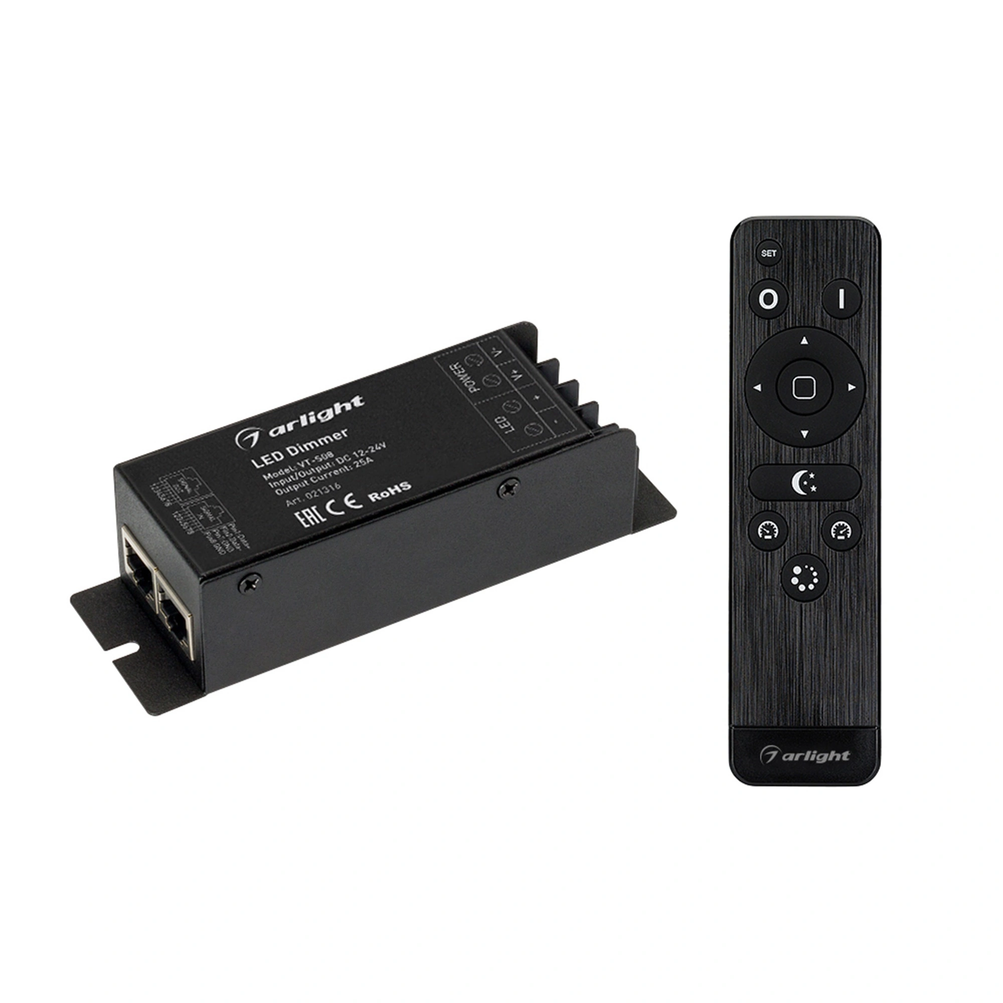 Комплект: мощный 1-канальный диммер со стильным радиопультом черного цвета с 12 кнопками, для управления одноцветной светодиодной лентой. Этот комплект устройств позволит легко и удобно регулировать яркость освещения, осуществлять включение и выключение света, включать динамические программы и регулировать их скорость. Пульт имеет горячие кнопки предустановок яркости источника света. Питание диммера имеет диапазон напряжений от 12В до 24В, максимальный ток 25А на 1 канал, максимальная мощность 300-600Вт (в зависимости от напряжения питания). Диммер имеет порты RJ45 для возможности проводного соединения устройств между собой и синхронизации их работы. При потере питания диммера последнее состояние яркости сохраняется. Питание пульта осуществляется от 2-х батареек ААА. Габариты диммера составляют 127х41х32мм, габариты пульта составляют 150х40х20мм.