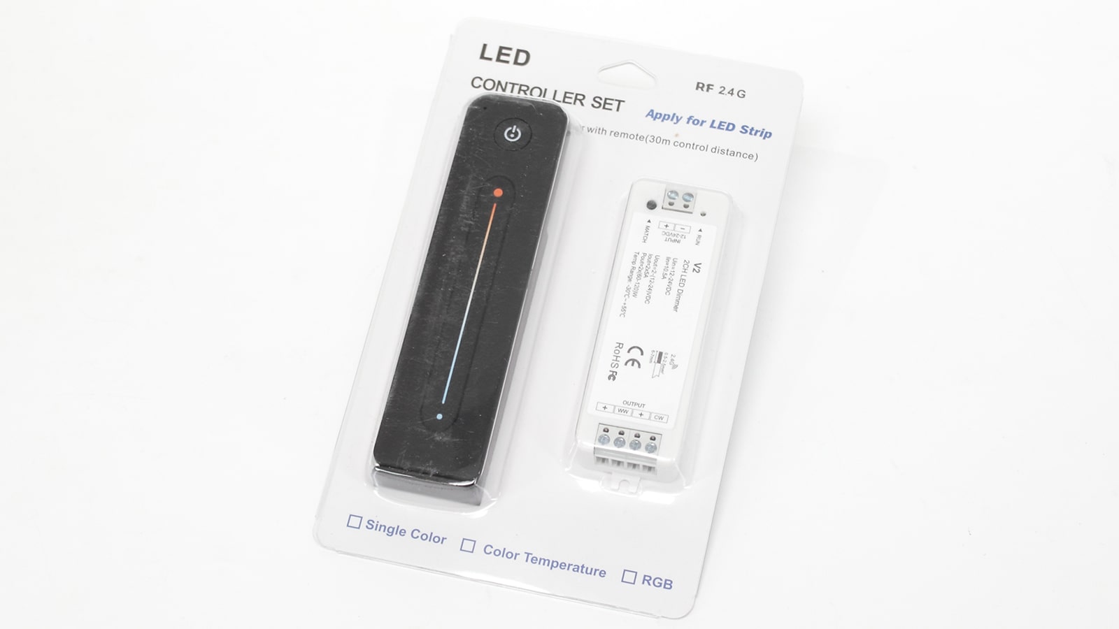 Контроллер CCT для светодиодной ленты с сенсорным радиопультом в комплекте. Дальность действия пульта 30 метров. 2 канала,напряжение питания 12-24V, максимальный выходной ток 5A на канал, мощность 120-240W, рабочая частота 2,4GHz. Работает со всем оборудованием серии ICLED PRO. Рабочая температура -30 - +55 градусов. Размеры контроллера 105x33x18мм. Размеры упаковки 200x125x20мм. Вес 130г.