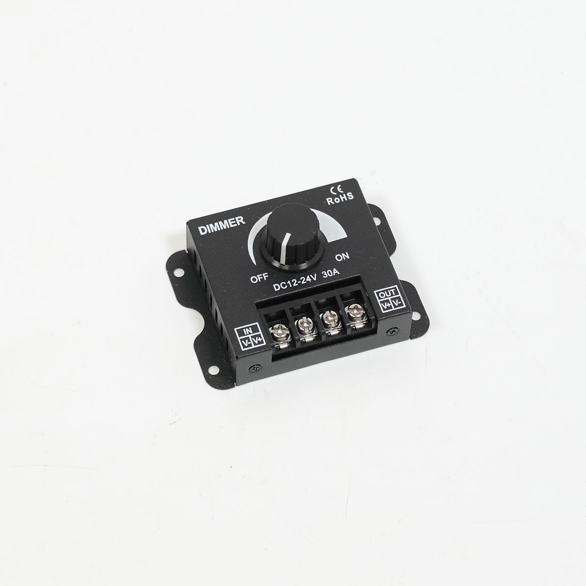 Диммер с потенциометром для светодиодных лент.Напряжение питания 12-24V, 1 канал, выходной ток до 30A на канал, мощность 360-720W, размеры 86х62х35мм. Вес 110г