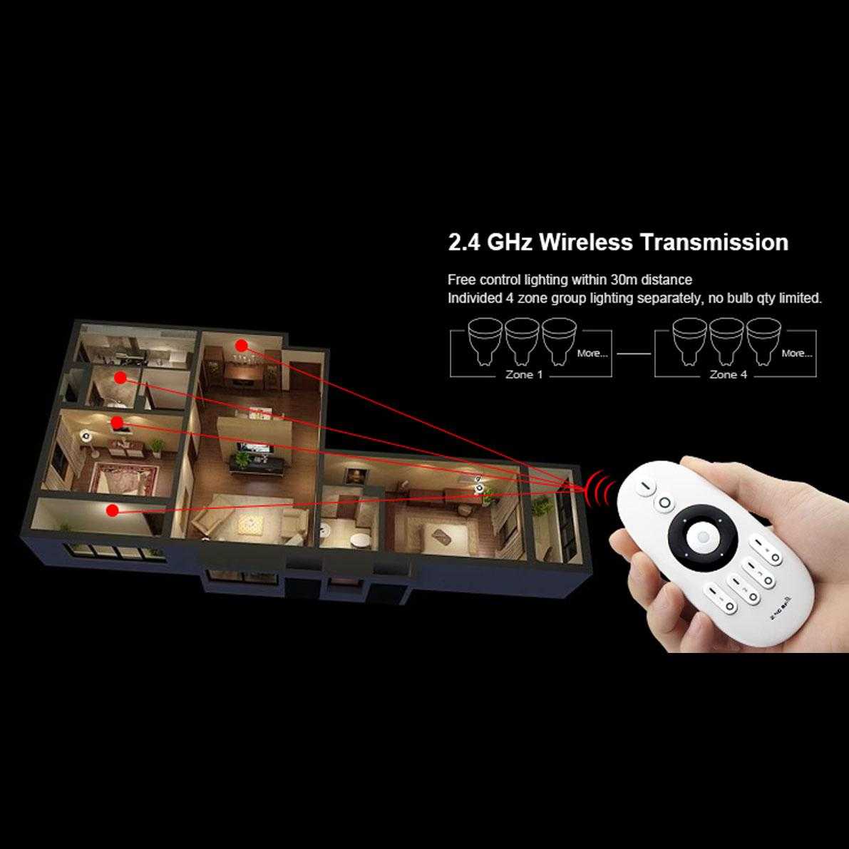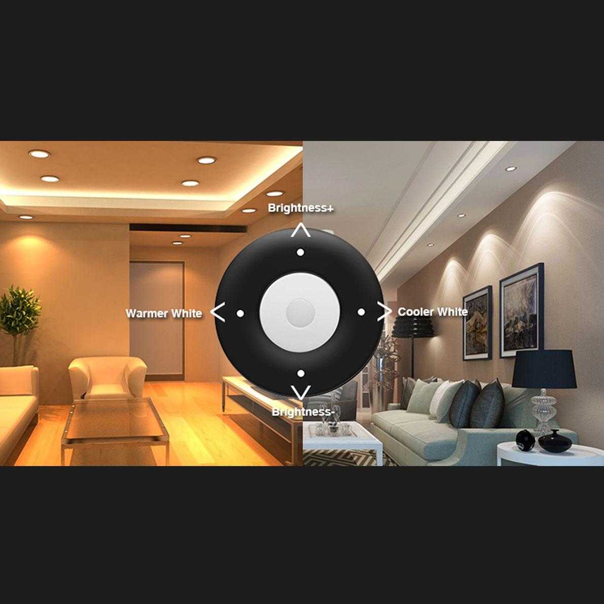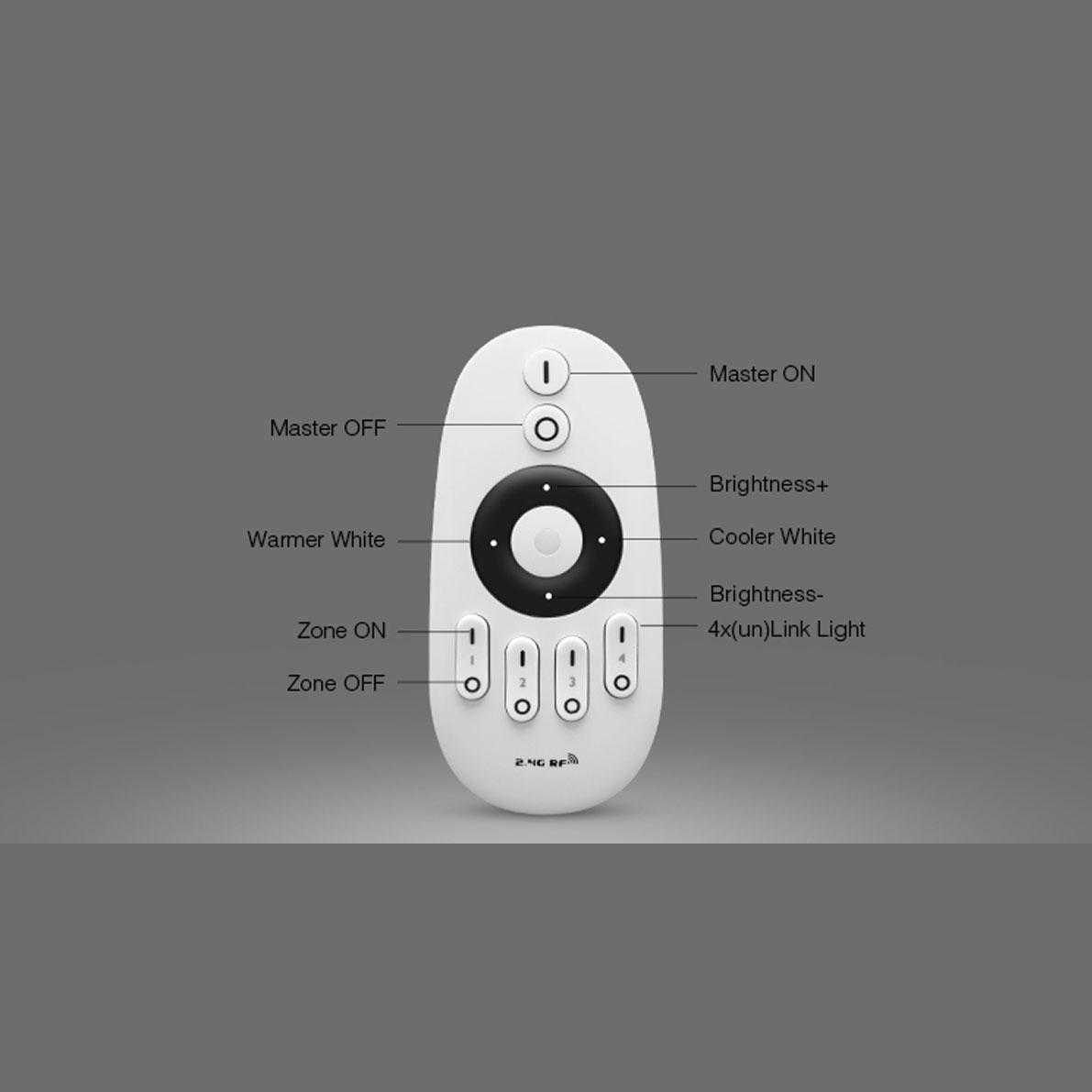 Пульт управления кнопочный Mi-Light для контроллеров FUT036, FUT035. Возможность поддержки до 4 зон. Регулировка яркости, выбор температуры свечения на ленте MIX. Размеры 110х53х22мм. Вес 45г.