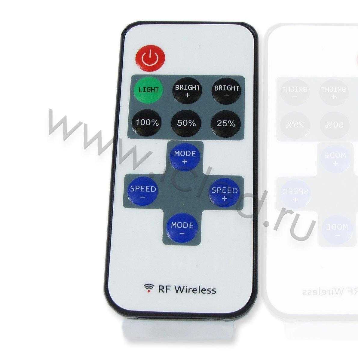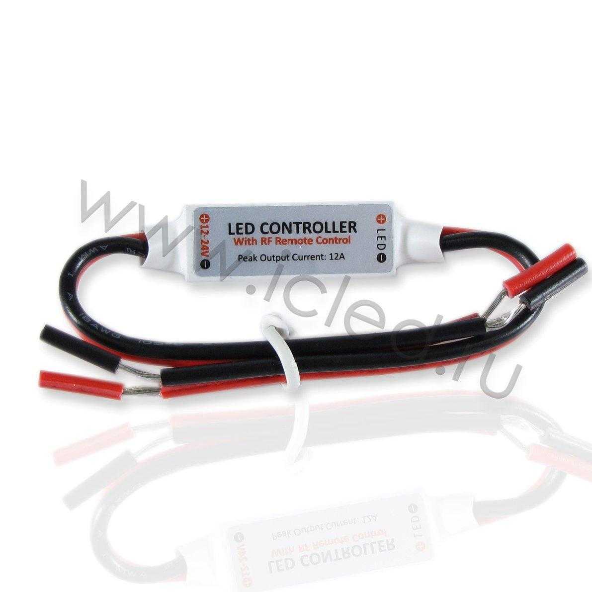 Миниатюрный диммер со строб-эффектом для светодиодных лент. Пульт RF в комплекте. Напряжение питания 5-24V, выходной ток до 12A, мощность 5В- 60Вт, 12В- 144Вт, 24В- 288Вт. Размеры 110x56x34мм.