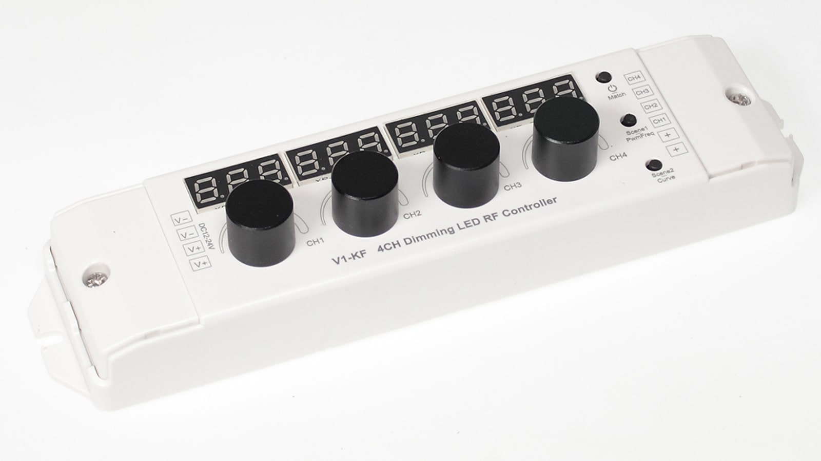 Диммер с потенциометрами и дисплеями. Напряжение питания 12-24V, выходной ток 4ch x 4A, мощность 192W(12V), 384W(24V). 256 уровней регулировки яркости от 0 до 100%. Управление по RF 2,4GHz+потенциометры на корпусе. Регулируемая частота PWM 250/500/2000/8000 Hz позволяет избежать мерцания при видеосьемках. Работает со всем оборудованием серии ICLED PRO. Дальность действия управления по радиосигналу до 30м (прямая видимость без препятствий). Рабочая температура от -30 до +55 градусов. Степень защиты IP20. Гарантия 5 лет. Размеры 186х46х35 мм. Размеры упаковки 190x50x38мм. Вес 150г.