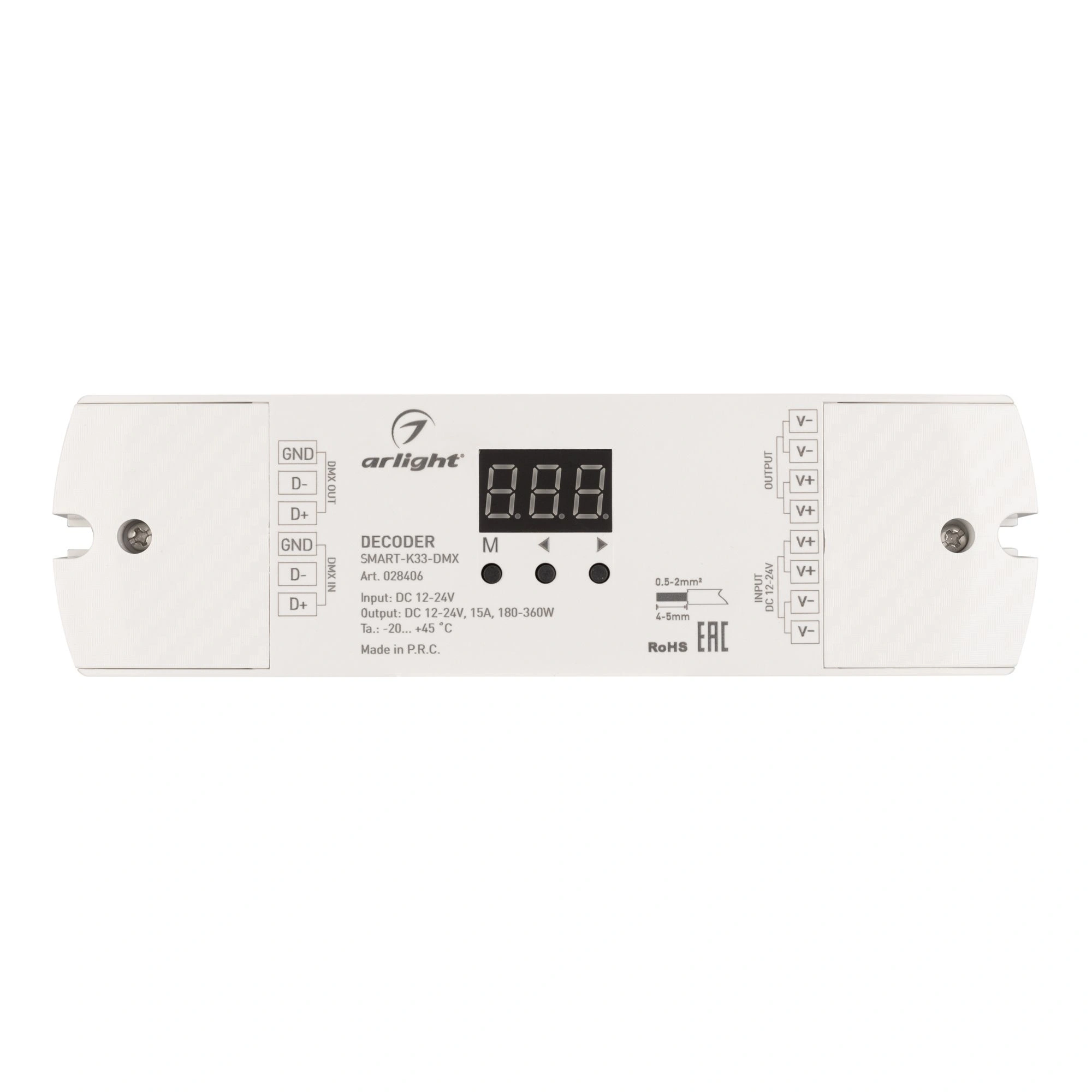 Декодер (преобразователь) цифрового сигнала DMX512 в ШИМ для управления светодиодными лентами. Декодер может регулировать яркость одноцветных лент, осуществлять включение и выключение света. Декодер совместим с панелями управления с выходом DMX512 и контроллерами DMX512. Также, управление декодером осуществляется кнопками на корпусе, а информация о режиме отображается на цифровом дисплее. Питание декодера имеет диапазон напряжений от 12В до 24В, максимальный ток 15А на 1 канал, максимальная мощность 180-360Вт (в зависимости от напряжения питания), 1 канал управления. Габариты декодера составляют 170х50х23мм, корпус белого цвета.