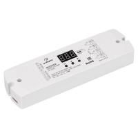 Декодер (преобразователь) цифрового сигнала DMX512 в ШИМ для управления светодиодными лентами. Декодер может регулировать яркость мультицветных лент, осуществлять включение и выключение света, управлять цветом. Декодер совместим с панелями управления с выходом DMX512 и контроллерами DMX512. Также, управление декодером осуществляется кнопками на корпусе, а информация о режиме отображается на цифровом дисплее. Питание декодера имеет диапазон напряжений от 12В до 24В, максимальный ток 5А на 1 канал, максимальная мощность 240-480Вт (в зависимости от напряжения питания), 4 канала управления. Габариты декодера составляют 170х50х23мм, корпус белого цвета.