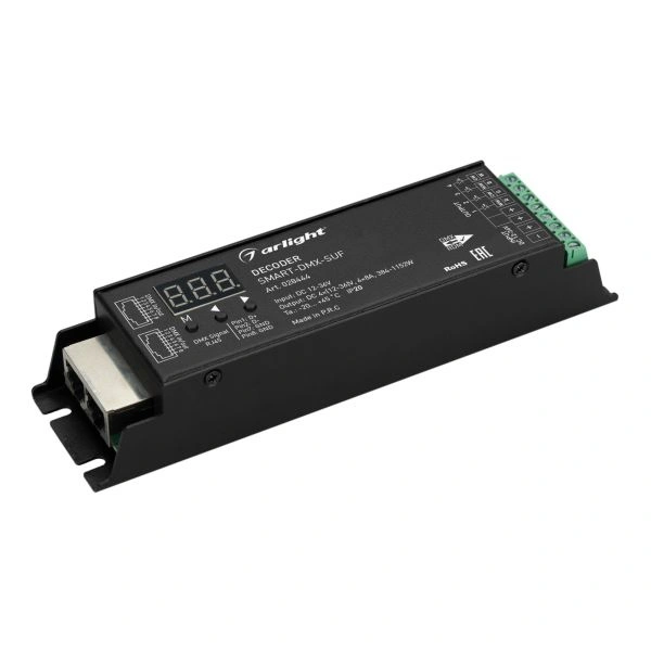 Декодер (преобразователь) цифрового сигнала DMX512 в ШИМ для управления светодиодными лентами. Декодер может регулировать яркость мультицветных лент, осуществлять включение и выключение света, управлять цветом. Декодер совместим с панелями управления с выходом DMX512 и контроллерами DMX512. Также, управление декодером осуществляется кнопками на корпусе, а информация о режиме отображается на цифровом дисплее. Устройство оснащено разъемами RJ-45, обеспечивающими трансляцию сигнала DMX512 на вход и выход. Питание декодера имеет диапазон напряжений от 12В до 36В, максимальный ток 8А на 1 канал, максимальная мощность 384-1150Вт (в зависимости от напряжения питания), 4 канала управления. Габариты декодера составляют 175х46х32мм, металлический корпус чёрного цвета.
