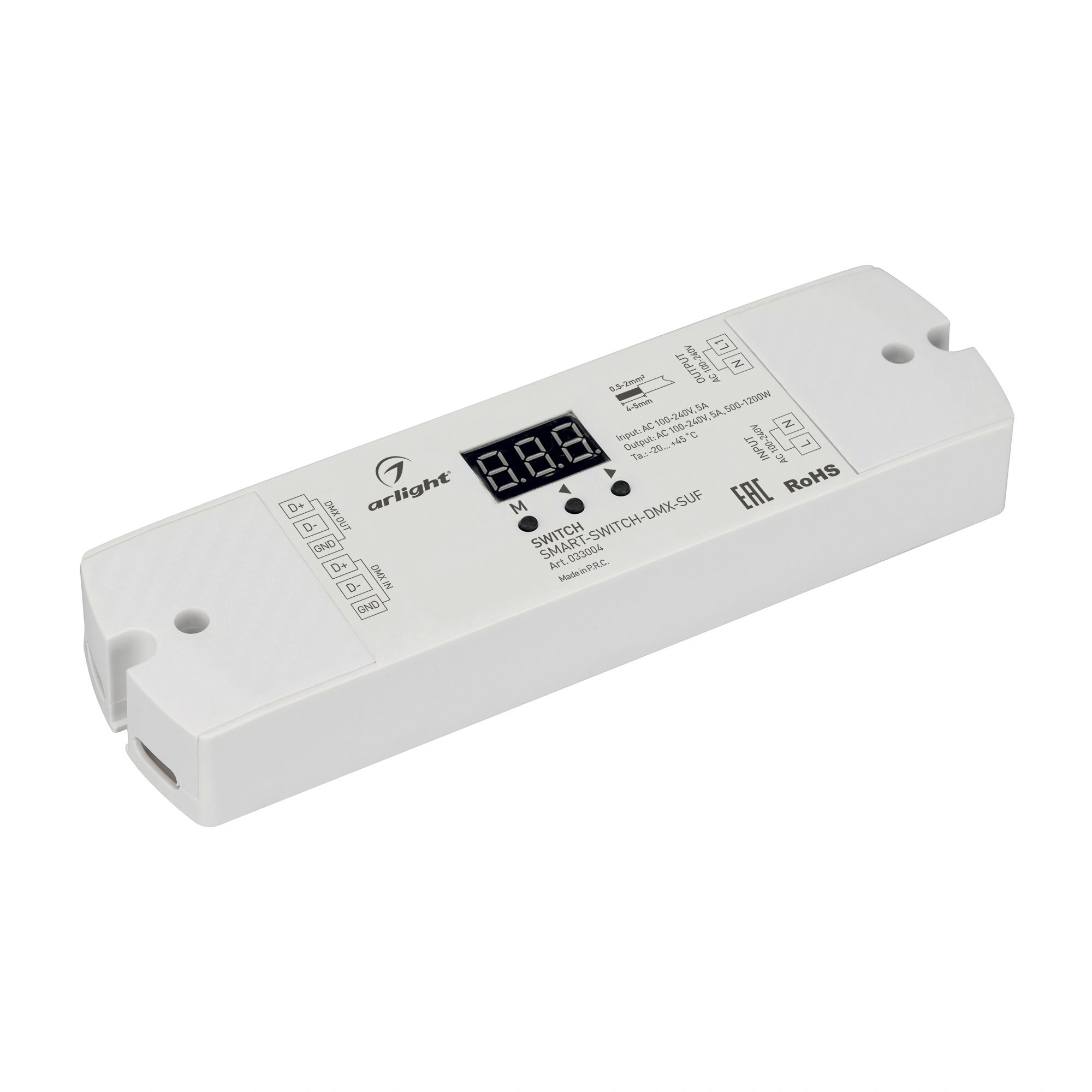 DMX-выключатель для любых видов нагрузки AC 230V, в том числе и гибкого неона. Напряжение питания AC 100-240V, максимальный ток нагрузки 5А, максимальная мощность при AC 230V - 1150W. DMX адрес задается кнопками на корпусе, цифровой дисплей. Габариты 170x50x23 мм.