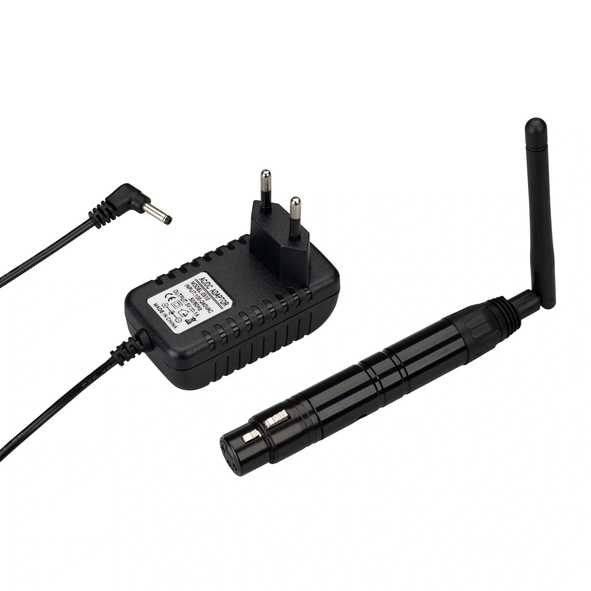Беспроводной приёмник сигнала DMX512, работающий в паре с беспроводным передатчиком сигнала 028416. Устройство обеспечивает стабильный прием сигнала на расстоянии до 400 метров от передатчика. Устройство оснащено разъемом XLR3 Male, что делает его совместимым с большим количеством декодеров, имеющих аналогичный разъем. Напряжение питания составляет всего 5В, обеспечиваемое надежным блоком питания, которым укомплектовано изделие. Габариты устройства составляют 215x21x21 мм, металлический корпус чёрного цвета.