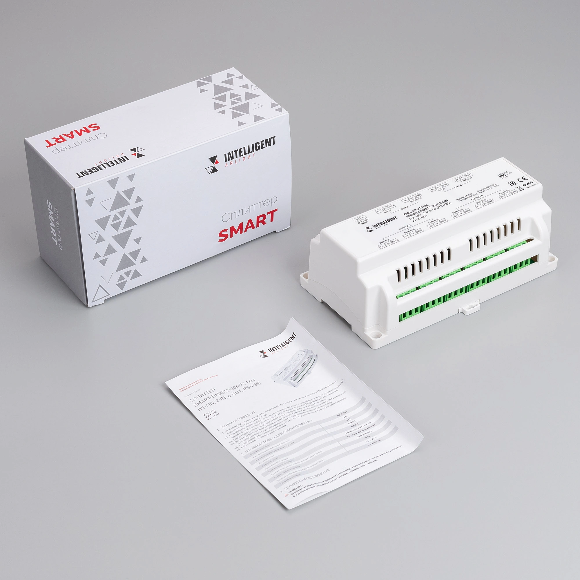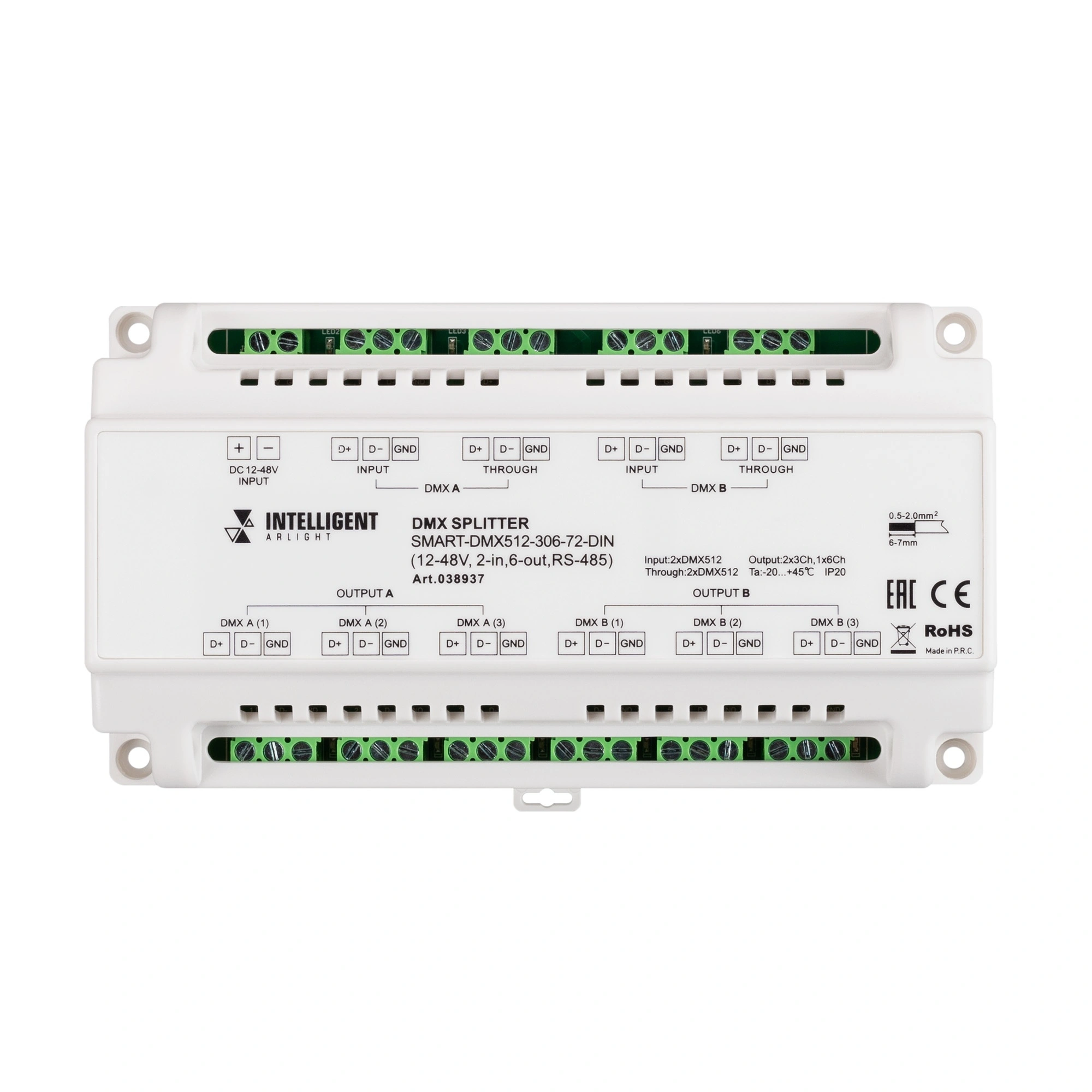 Сплиттер (усилитель) DMX512 сигнала. Вход - 2 порта DMX512, выход - 6 портов DMX512. Напряжение питания DC 12-48V, разъемы RS-485 (терминальные клеммы). Габариты 160х88х60 мм.