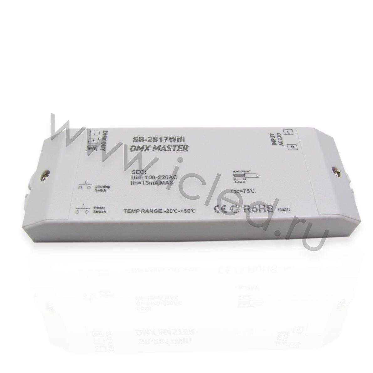DMX контроллер, управление от смартфона (IOS, Android) или по радиоканалу пультами SR-2818, 2819, 2819S (поставляются отдельно), до 8 зон. Питание 220VAC, выход цифровой сигнал DMX. Подключение лент через любой DMX декодер. Размеры 177х57х21 мм.