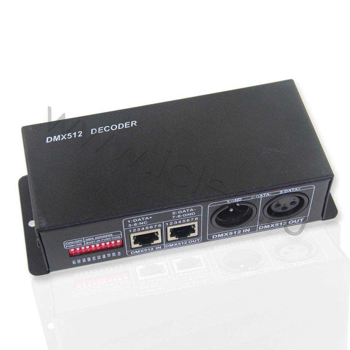 Декодер DMX 512 для управления светодиодной лентой и прожекторами. Имеет вход и выход DMX. 3 канала, входное напряжение 12-24V, выходной ток 350mA на канал. Размеры 165x68x40мм.