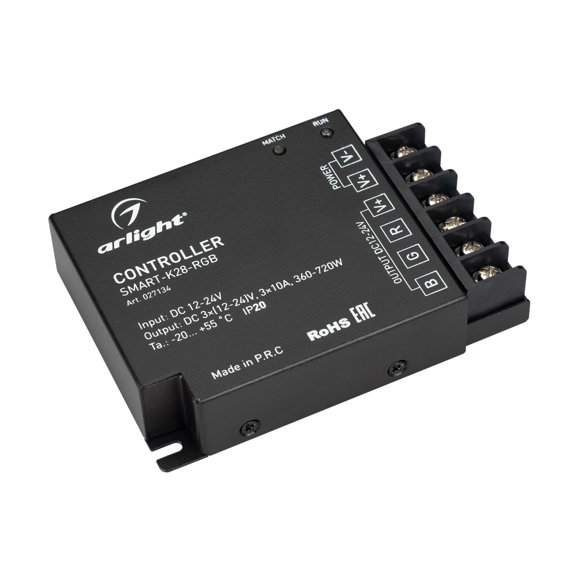 Контроллер для светодиодной RGB ленты (ШИМ). Питание/рабочее напряжение 12-24VDC, максимальный ток 10A на канал, 3 канала, максимальная мощность 360-720W. Винтовые клеммы. Корпус - PVC. Габариты 110x75x25 мм. Управляется пультами и панелями серии SMART (поставляются отдельно).
