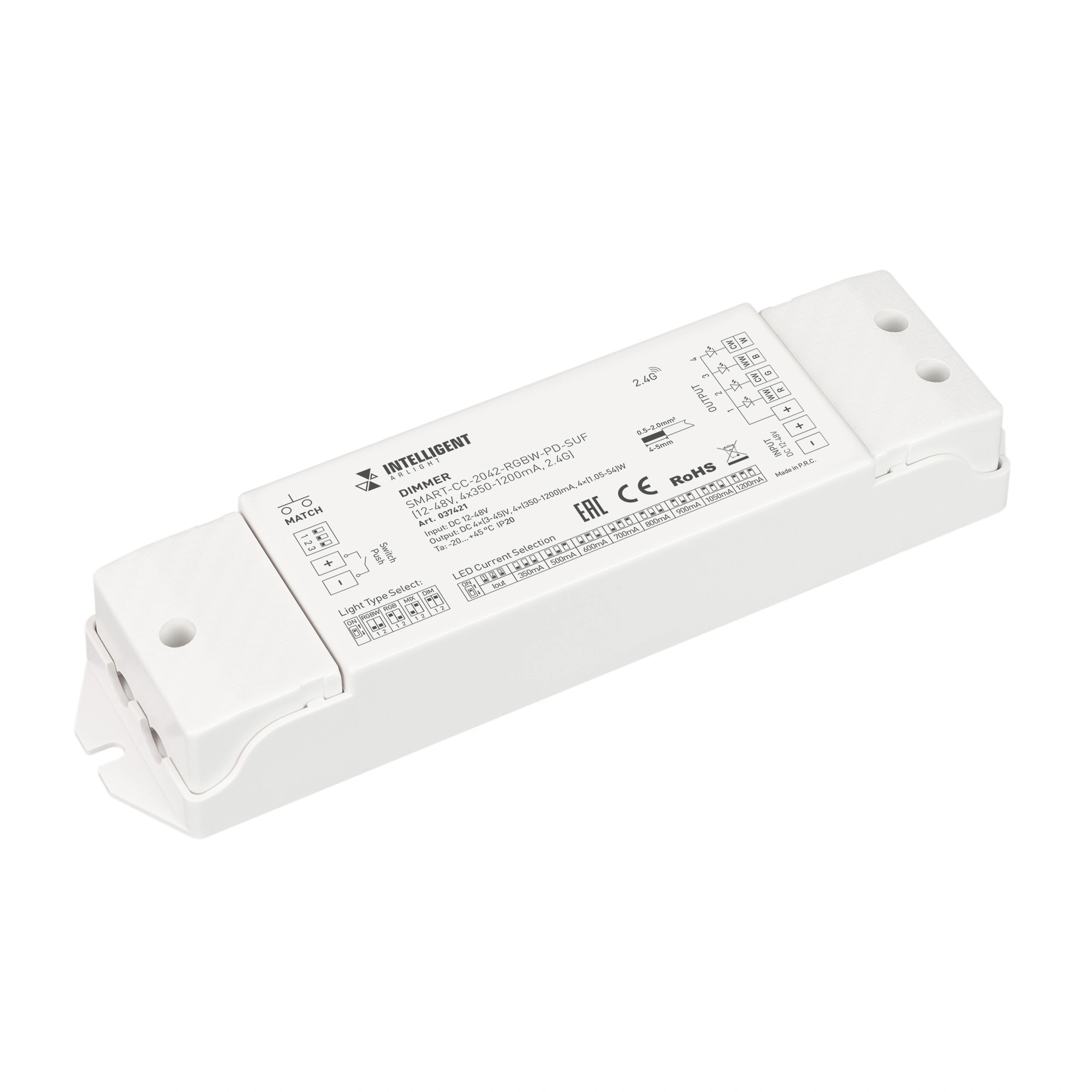 Диммер тока (CC) для управления мультицветными (RGBW) светодиодными светодиодными светильниками и мощными светодиодами с постоянным током. Выполняет основные фукнции: включение/выключение, регулировка яркости и цвета. Устройство совместимо с радиочастотными пультами дистанционного управления и настенными панелями управления серии SMART. Возможна привязка до 10 пультов или панелей управления. Питание диммера имеет диапазон напряжений от 12В до 48В, максимальный ток 350-1200mA на 1 канал, максимальная мощность 4.2-216Вт (в зависимости от напряжения питания), 4 канала управления. Габариты диммера составляют 175х45х27мм, корпус белого цвета.