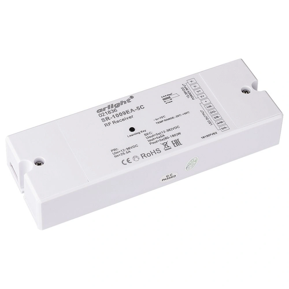 Контроллер для управления мультицветной 5-канальной светодиодной лентой (RGB-MIX). Позволяет осуществлять включение/выключение, регулировку яркости ленты по ШИМ, управление цветовой температуры и цветом. 5 каналов управления, максимальный ток 5А на канал, максимальная мощность 300-900 Вт (в зависимости от напряжения питания). Напряжение питания от 12 до 36В. Габариты составляют 168х58х28 мм, пластиковый корпус белого цвета. Управляется пультами и панелями серии SR-1009x (поставляются отдельно, см. совместимые).