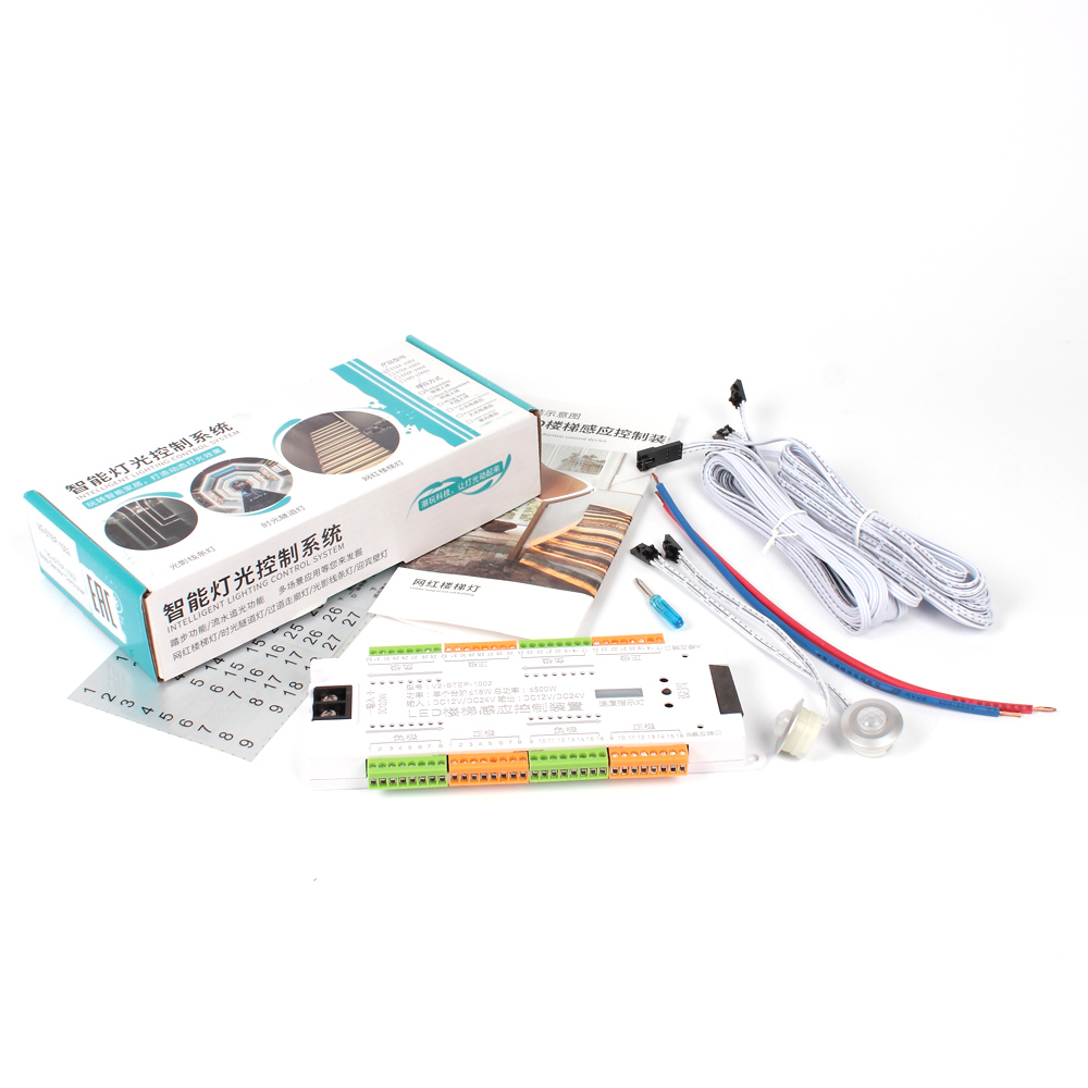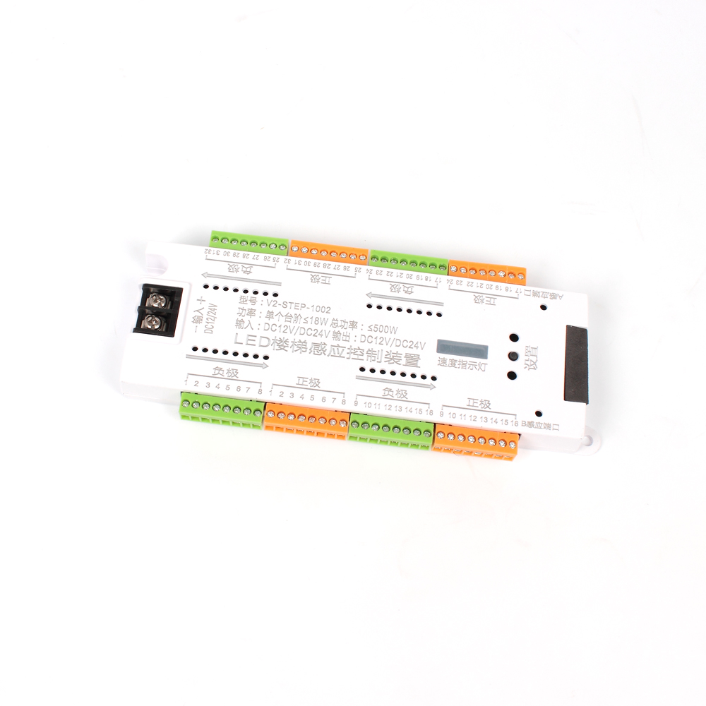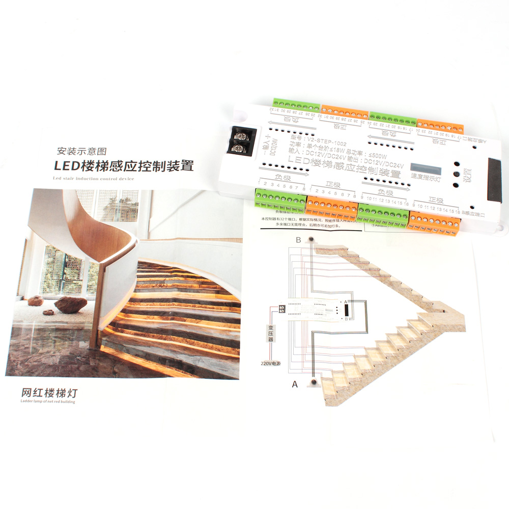 Контроллер многоканальный для ступеней. Напряжение питания 12/24V, максимальный выходной ток 1,5A на канал, 1-32 каналов, настраивается кнопкой на корпусе контроллера, мощность до 18Вт на канал. Управляется с помощью двух ИК-датчиков, устанавливыемых в начале и конце лестницы. Количество ступеней (1-32шт) и скорость (1-5) включения каналов регулируется кнопкой на корпусе контроллера. Длина кабеля датчика 2х5м. Размеры 180x80x20мм. Размеры упаковки 225х105х50мм. Вес 360г.