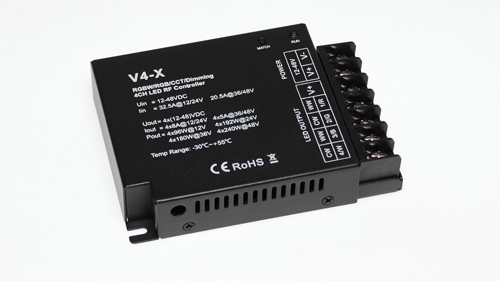 Контроллер V4-X. Поддержка RGBW/RGB/CCT/DIM. Напряжение питания 12-48V, выходной ток 4ch x 8A(12/24V), 4ch x 5A(36/48V) мощность 384W(12V), 768W(24V), 720W(36V), 960W(48V). 256 уровней регулировки яркости от 0 до 100%. Работает со всем оборудованием серии ICLED PRO. Дальность действия управления по радиосигналу до 15м (прямая видимость без препятствий). Рабочая температура от -30 до +55 градусов. Степень защиты IP20. Гарантия 5 лет. Размеры 117х84х24 мм. Размеры упаковки 120x90x30мм. Вес 340г.