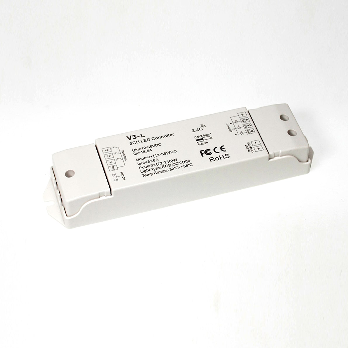 Контроллер RGB. Поддержка RGB/CCT, DIM. Напряжение питания 12-36V, выходной ток 3chx6A, мощность 72-216W.256 уровней регулировки яркости от 0 до 100%. Управление по RF 2,4GHz.Работает со всем оборудованием серии ICLED PRO. Дальность действия управления по радиосигналу до 30м (прямая видимость без препятствий). Рабочая температура от -30 до +55 градусов. Степень защиты IP20. Гарантия 5 лет. Размеры 175х45х27 мм. Размеры упаковки 180x50x38мм. Вес 130г.