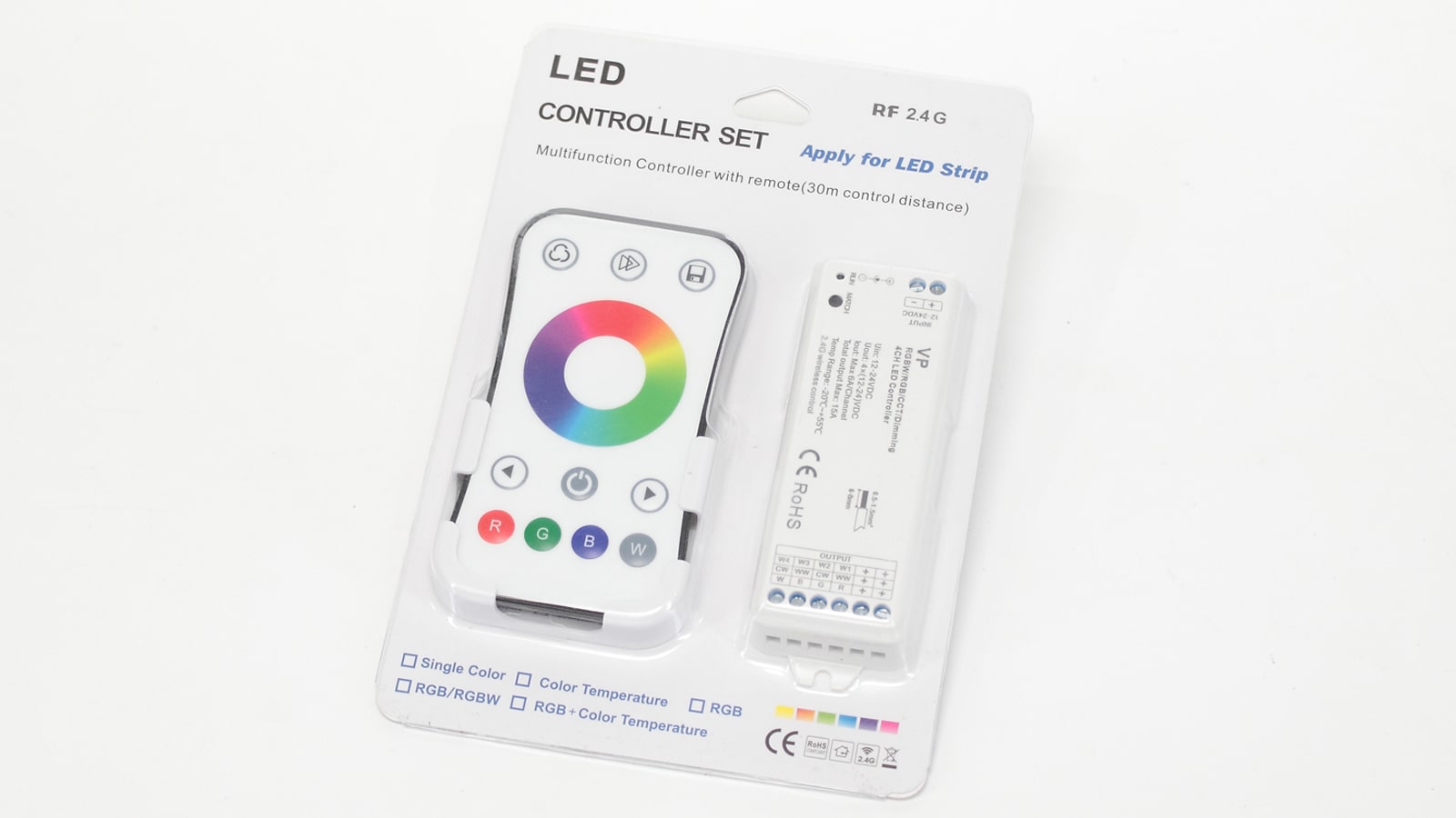 Контроллер RGBW для светодиодной ленты с сенсорным радиопультом в комплекте. Дальность действия пульта 30 метров. 4 канала,напряжение питания 12-24V, максимальный выходной ток 6A на канал. max 15А, мощность 180-360W, рабочая частота 2,4GHz. Работает со всем оборудованием серии ICLED PRO. Рабочая температура -20 - +55 градусов. Размеры контроллера 115x38x20мм. Размеры упаковки 200x135x25мм. Вес 130г.