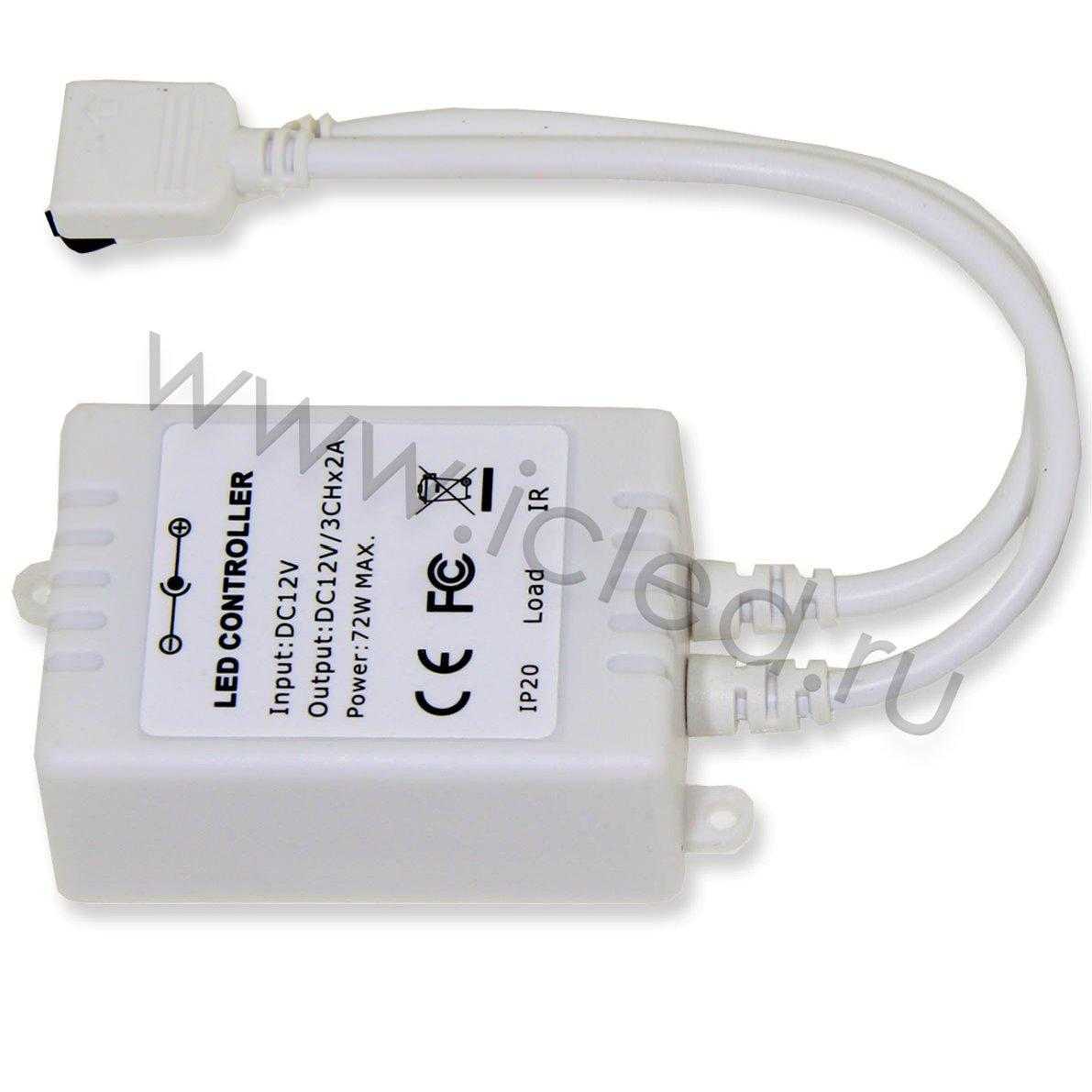 Контроллер RGB для светодиодной ленты. С инфракрасным пультом в комплекте (24 кнопки). 16 стандартных программ. Напряжение питания 12V, выходной ток до 6A, мощность 72W. Размеры 63x35x22мм.