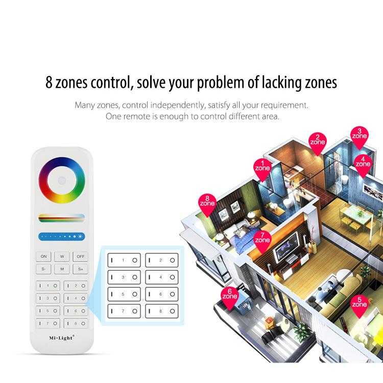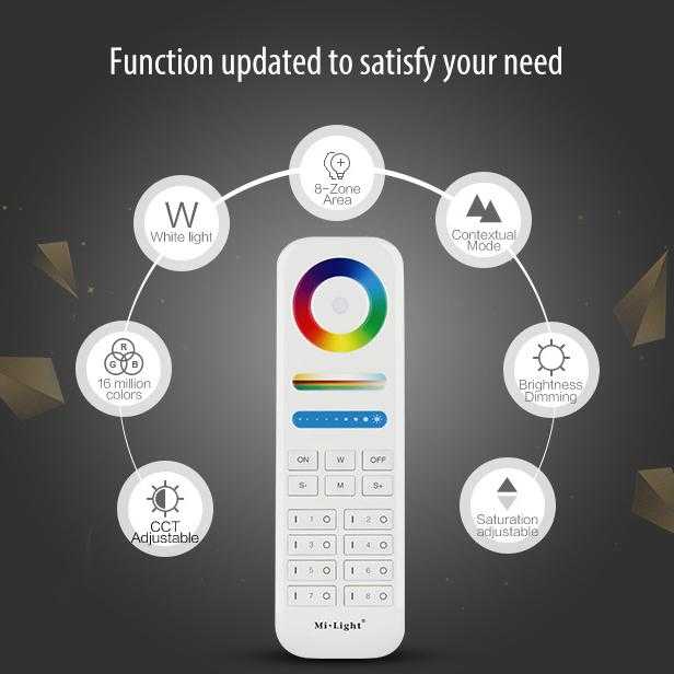 Пульт управления сенсорный Mi-Light для контроллера LS2 (арт.57352). Возможность поддержки до 8 зон. Выбор цвета, регулировка яркости, скорости, стандартные динамические программы смены цвета. Размеры 153x47x19мм. Вес 90г.