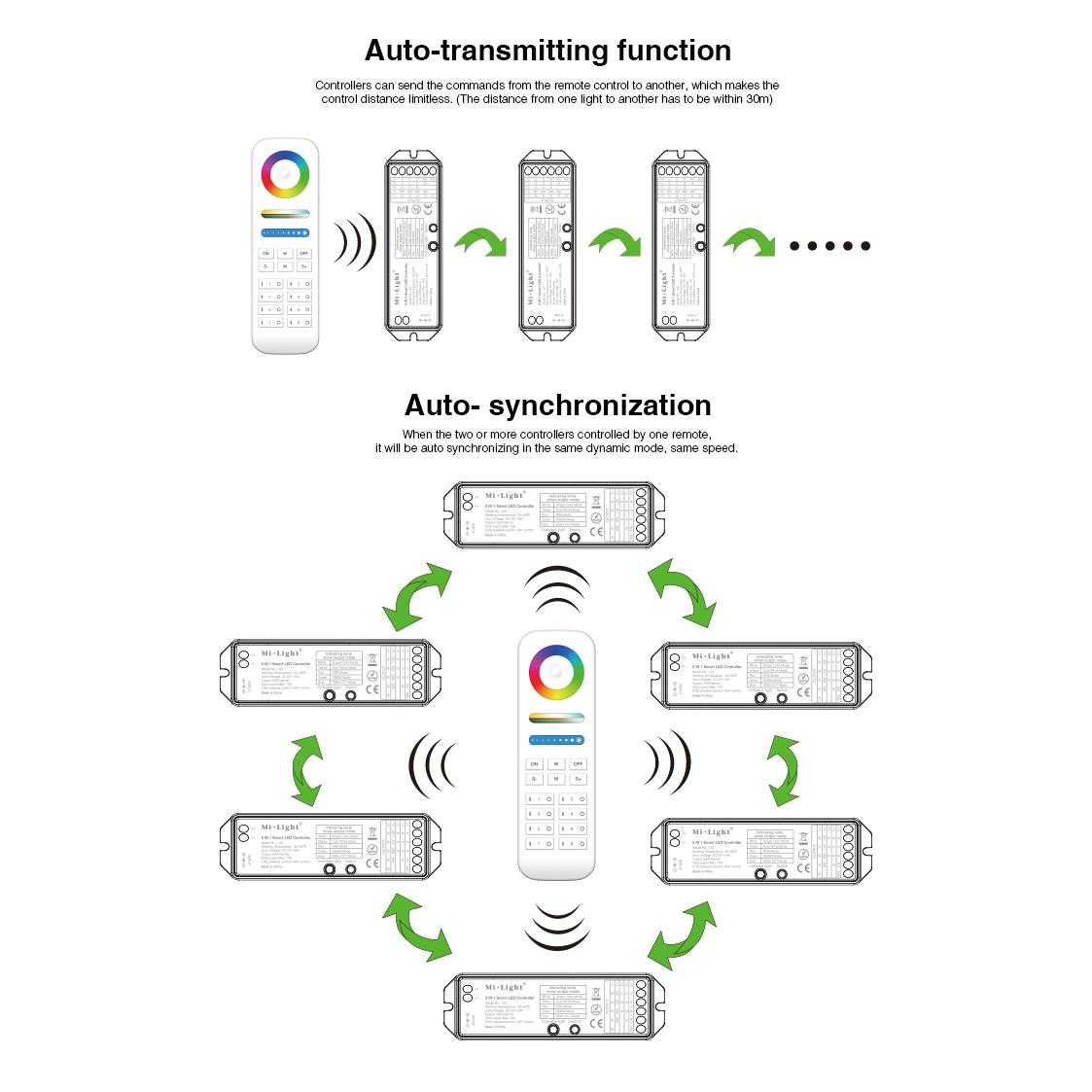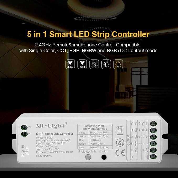 Контроллер Mi-Light LS2 для светодиодной ленты. Работает с пультом FUT089 (арт.57350) и панелью В8 (арт.57351). Стабильный прием сигнала на удалении до 30 метров. Напряжение питания 12-24V, выходной ток до 6A на канал, 5 каналов, общая мощность 12V- 180W, 24V- 360W, рабочая частота 2,4GHz. Размеры 124x38x23мм. Вес 60г.