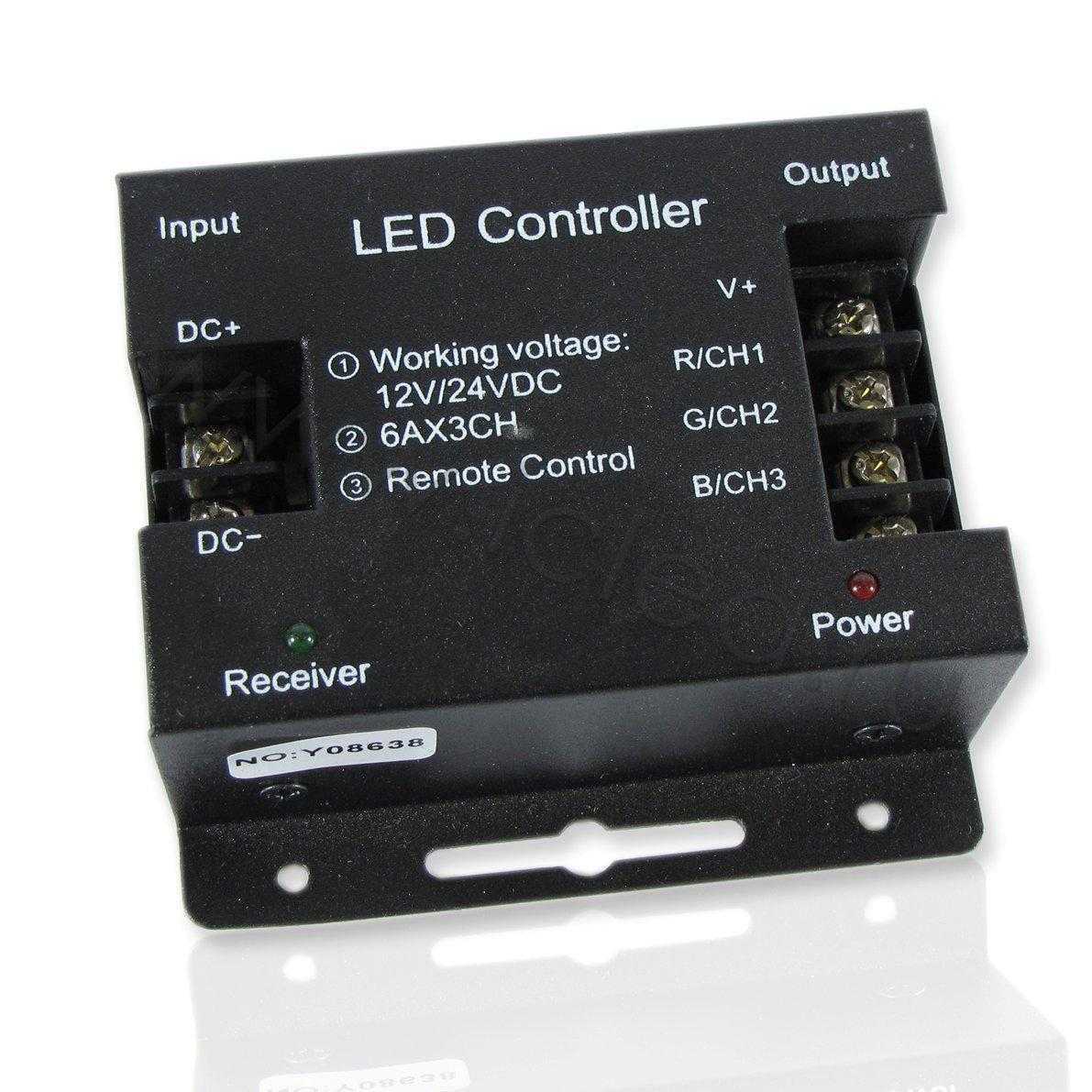 Контроллер RGB для светодиодной ленты. С сенсорным RF пультом в комплекте. Напряжение питания 12-24V, выходной ток до 18A, мощность 12V-216W, 24V-432W. Размеры 83х81х32мм. Вес 370г.