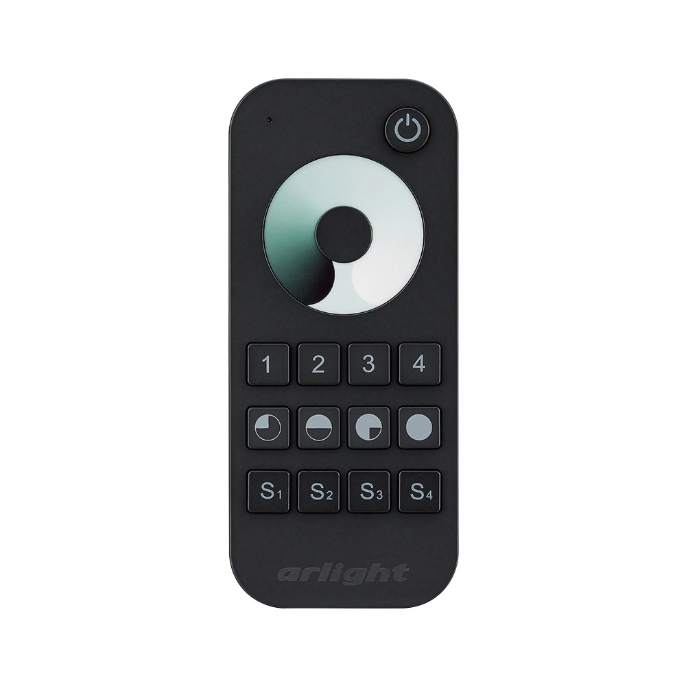 Кнопочный радиочастотный пульт чёрного цвета с сенсорным кольцом, предназначенный для управления одноцветными источниками света. Поддерживает основные функции: включение и выключение света, регулировку яркости, управление 4 световыми зонами, включение и выключение 4-х пользовательских световых сцен. Устройство совместимо с диммерами и контроллерами серии SMART, поддерживающими управление по радиоканалу 2.4G. К одному пульту возможно привязать неограниченное количество диммеров и контроллеров. Питание 3В осуществляется от 2-х батареек ААА. Корпус пульта выполнен из пластика с покрытием Soft-Touch. Габариты устройства 122x53x17.5 мм.
