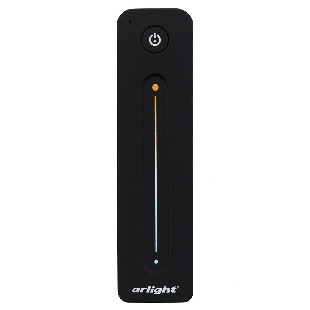 Радиочастотный пульт-слайдер чёрного цвета, предназначенный для управления мультибелыми (MIX) источниками света. Поддерживает основные функции: включение и выключение света, регулировку яркости, изменение цветовой температуры, управление 1 световой зоной. Устройство совместимо с диммерами и контроллерами серии SMART, поддерживающими управление по радиоканалу 2.4G. К одному пульту возможно привязать неограниченное количество диммеров и контроллеров. Питание 3В осуществляется от батарейки CR2032. Корпус пульта выполнен из пластика с покрытием Soft-Touch. Габариты устройства 139x36x11 мм.