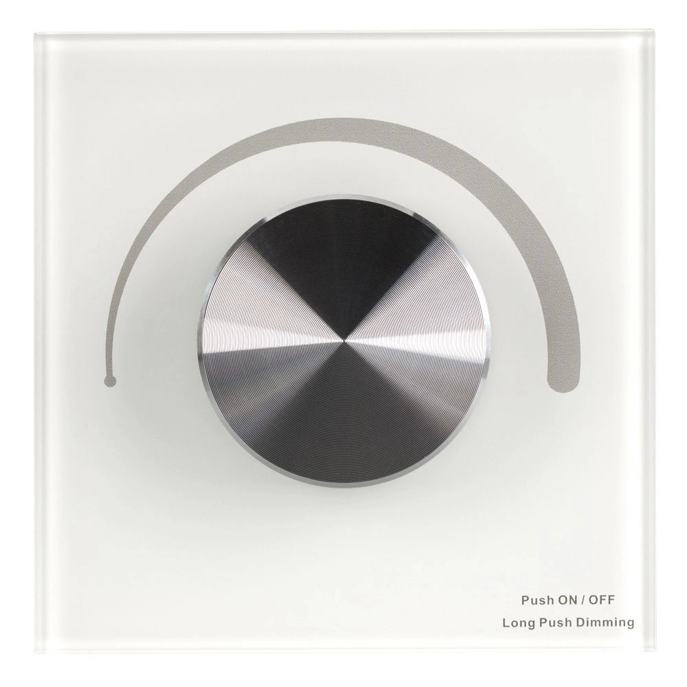 Встраиваемая роторная панель белого цвета из стекла, с защитой от появления мелких царапин. Предназначена для управления одноцветными источниками света (ШИМ) с помощью роторного вращателя. Основные выполняемые функции: включение/выключение света, регулировка яркости. Изделие может использоваться как диммер с 3 параллельными выходами для подключения одноцветных светодиодных лент. Также, возможно применение в качестве однозонного пульта дистанционного управления диммерами и контроллерами серии SMART. Устройство может управляться пультами или панелями серии SMART. К одной панели возможно привязать неограниченное количество диммеров и контроллеров. Устройство совместимо с диммерами и контроллерами серии SMART, с управлением по радиоканалу 2.4G. Питание 12-24В, 3 канала управления, максимальный ток 4А на канал, суммарная мощность нагрузки 144-288 Вт. Габариты 86х86х50 мм, корпус из пластика, лицевая часть из стекла. Устройство устанавливается в стандартного размера монтажные коробки.