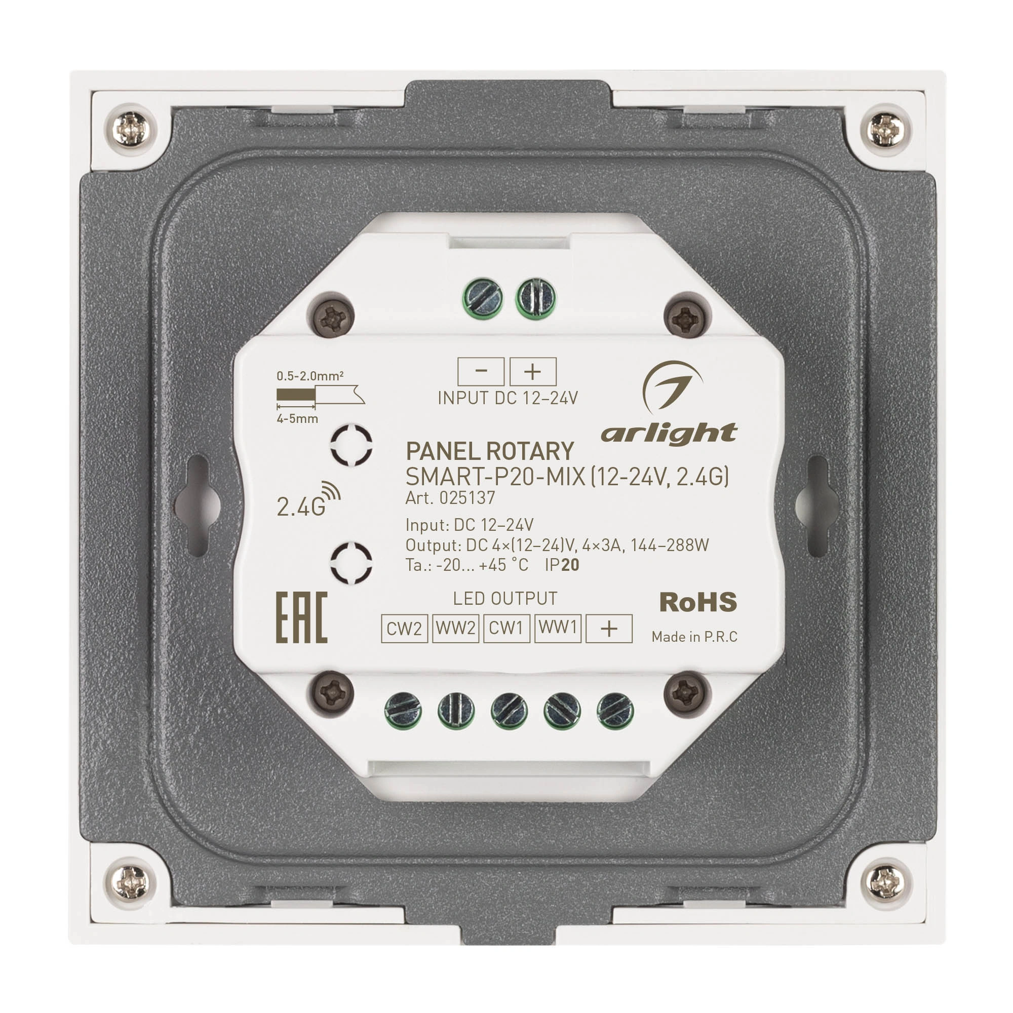 Встраиваемая роторная панель белого цвета из стекла, с защитой от мелких царапин. Предназначена для управления мультибелыми (MIX) источниками света (ШИМ) с помощью роторного вращателя. Основные функции: включение/выключение света, регулировка яркости, изменение цветовой температуры. Изделие можно использовать как диммер с 2 парами параллельных выходов для подключения мультибелых светодиодных лент или в качестве однозонного пульта управления диммерами и контроллерами серии SMART. Устройство может управляться пультами дистанционного управления или панелями серии SMART. К одной панели можно привязать неограниченное количество диммеров и контроллеров. Устройство совместимо с диммерами и контроллерами серии SMART, с управлением по радиоканалу 2.4G. Питание 12-24В, 4 канала управления, максимальный ток 3А на канал, суммарная мощность нагрузки 144-288 Вт. Габариты: 86х86х50 мм, корпус из пластика, лицевая часть из стекла. Устройство устанавливается в стандартного размера монтажные коробки.