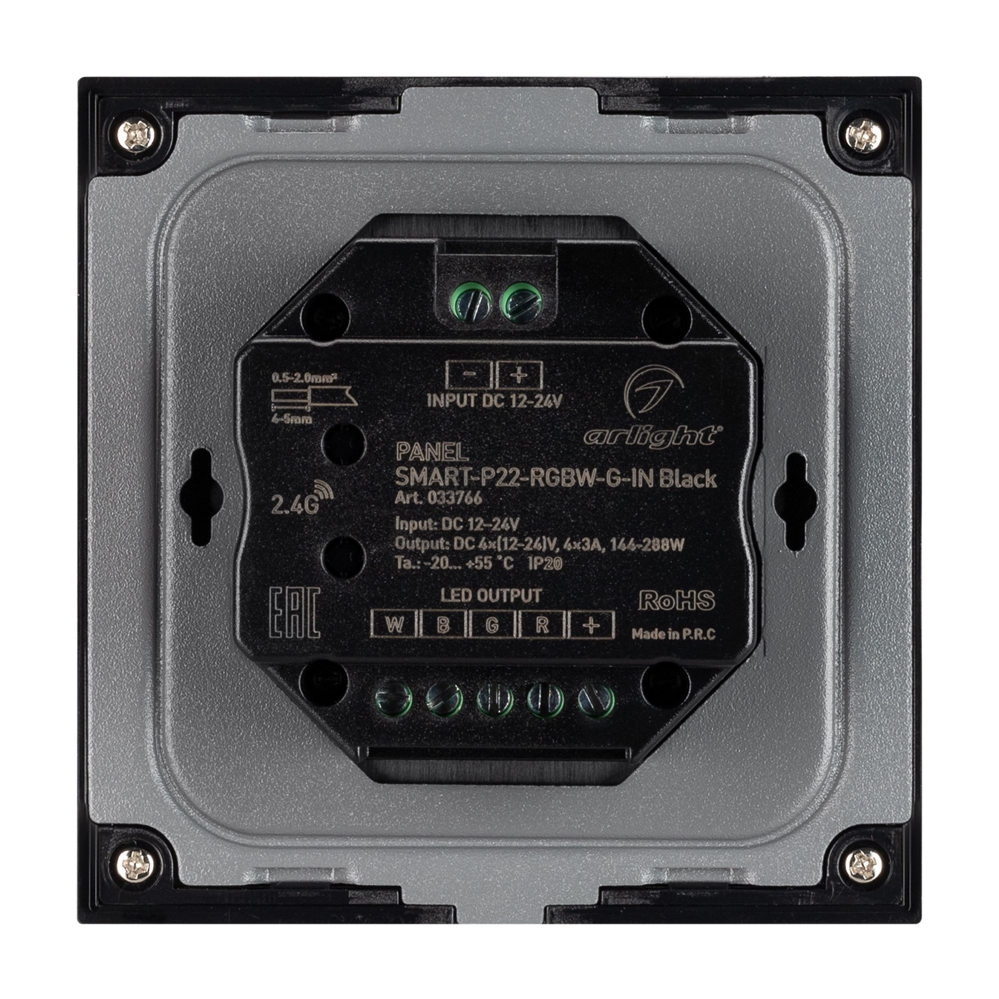 Встраиваемая сенсорная панель чёрного цвета из стекла, с защитой от мелких царапин. Предназначена для управления мультицветными (RGBW) источниками света (ШИМ) с помощью сенсорной полосы. Основные функции: включение/выключение света, регулировка яркости, изменение цвета, включение и выключение 4-х пользовательских световых сцен. Изделие можно использовать как диммер с 4 выходами для подключения мультицветных лент. Возможно применение как однозонный пульт дистанционного управления диммерами и контроллерами серии SMART. Устройство может управляться пультами управления или другими панелями серии SMART. К одной панели можно привязать неограниченное количество диммеров и контроллеров. Устройство совместимо с диммерами и контроллерами серии SMART, с управлением по радиоканалу 2.4G. Питание 12-24В, 4 канала управления, макс. ток 3А на канал, суммарная мощность 144-288 Вт. Габариты: 86х86х37 мм, корпус из пластика, лицевая часть из стекла. Установка в монтажные коробки в стандартного размера.
