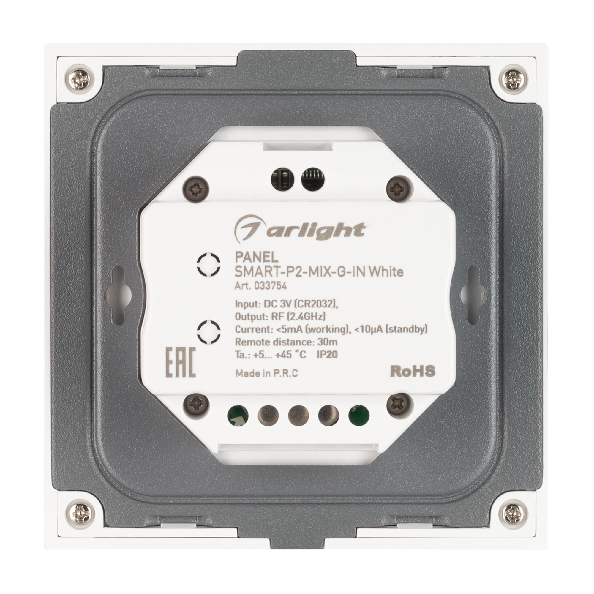 Встраиваемая роторная панель белого цвета, изготовленная из стекла, защищенного от появления мелких царапин. Предназначена для управления мультибелыми (MIX) источниками света (ШИМ) с помощью роторного вращателя. Основные выполняемые функции: включение и выключение света, регулировка яркости, изменение цветовой температуры. Удобное и точное управление с помощью стильного вращающегося регулятора. Изделие применяется в качестве однозонного пульта дистанционного управления диммерами и контроллерами серии SMART. К одной панели возможно привязать неограниченное количество диммеров и контроллеров. Устройство совместимо с диммерами и контроллерами серии SMART, поддерживающими управление по радиоканалу 2.4G. Питание 3В осуществляется от батарейки CR2032. Габариты панели 86х86х48 мм, корпус выполнен из пластика, лицевая часть - из стекла. Устройство устанавливается в стандартного размера монтажные коробки.