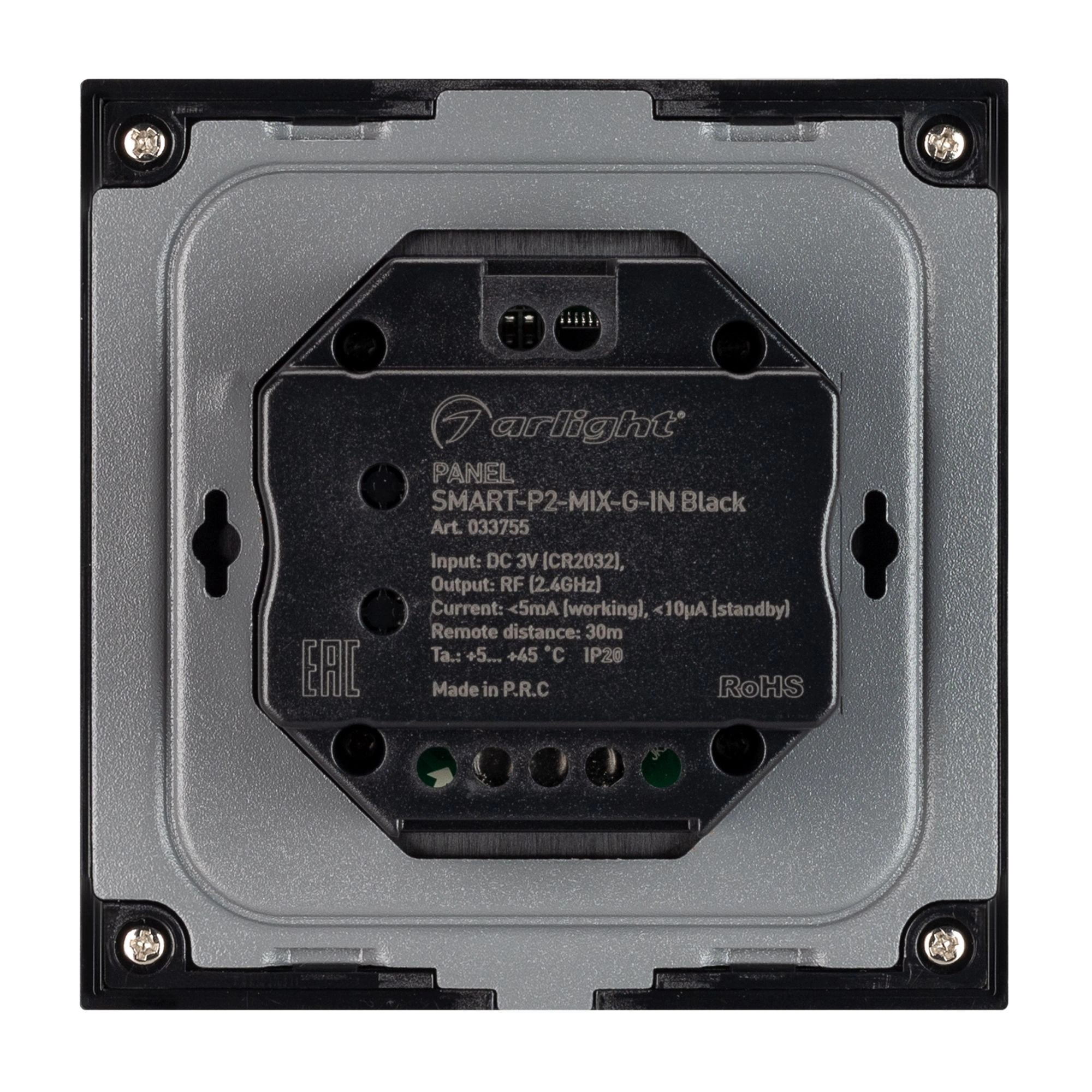 Встраиваемая роторная панель чёрного цвета, изготовленная из стекла, защищенного от появления мелких царапин. Предназначена для управления мультибелыми (MIX) источниками света (ШИМ) с помощью роторного вращателя. Основные выполняемые функции: включение и выключение света, регулировка яркости, изменение цветовой температуры. Удобное и точное управление с помощью стильного вращающегося регулятора. Изделие применяется в качестве однозонного пульта дистанционного управления диммерами и контроллерами серии SMART. К одной панели возможно привязать неограниченное количество диммеров и контроллеров. Устройство совместимо с диммерами и контроллерами серии SMART, поддерживающими управление по радиоканалу 2.4G. Питание 3В осуществляется от батарейки CR2032. Габариты панели 86х86х48 мм, корпус выполнен из пластика, лицевая часть - из стекла. Устройство устанавливается в стандартного размера монтажные коробки.