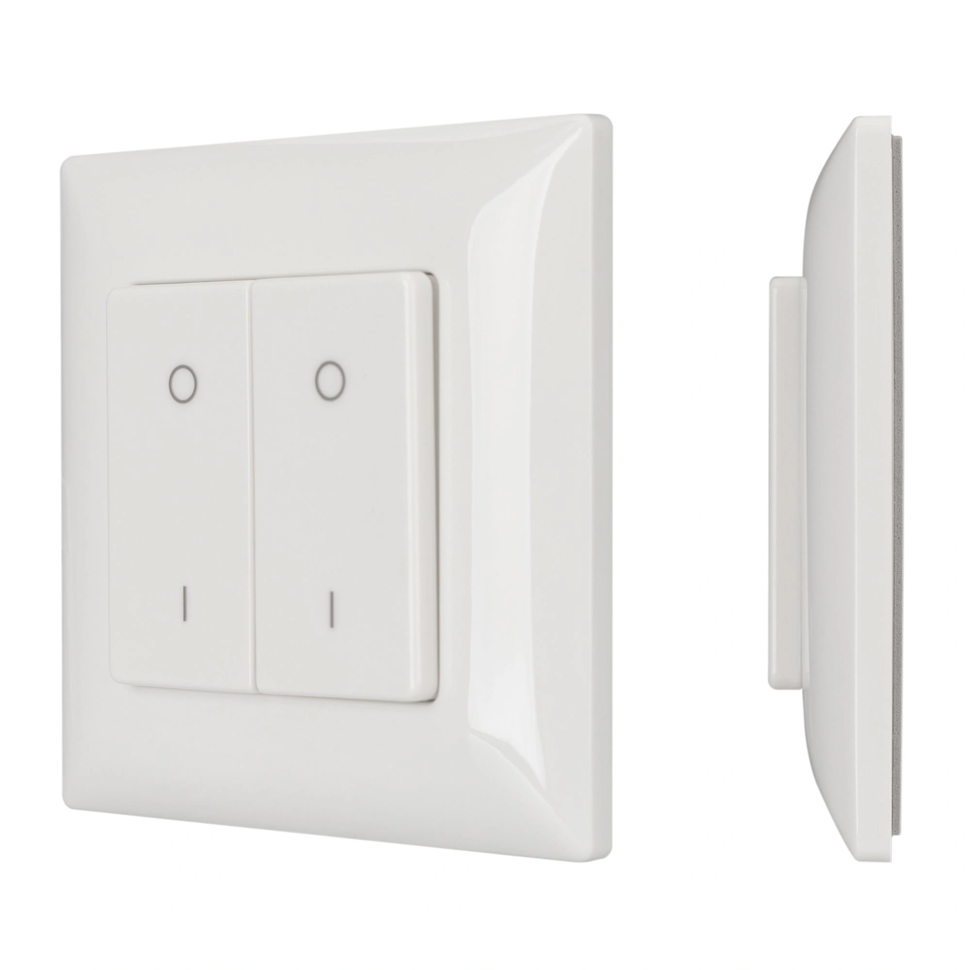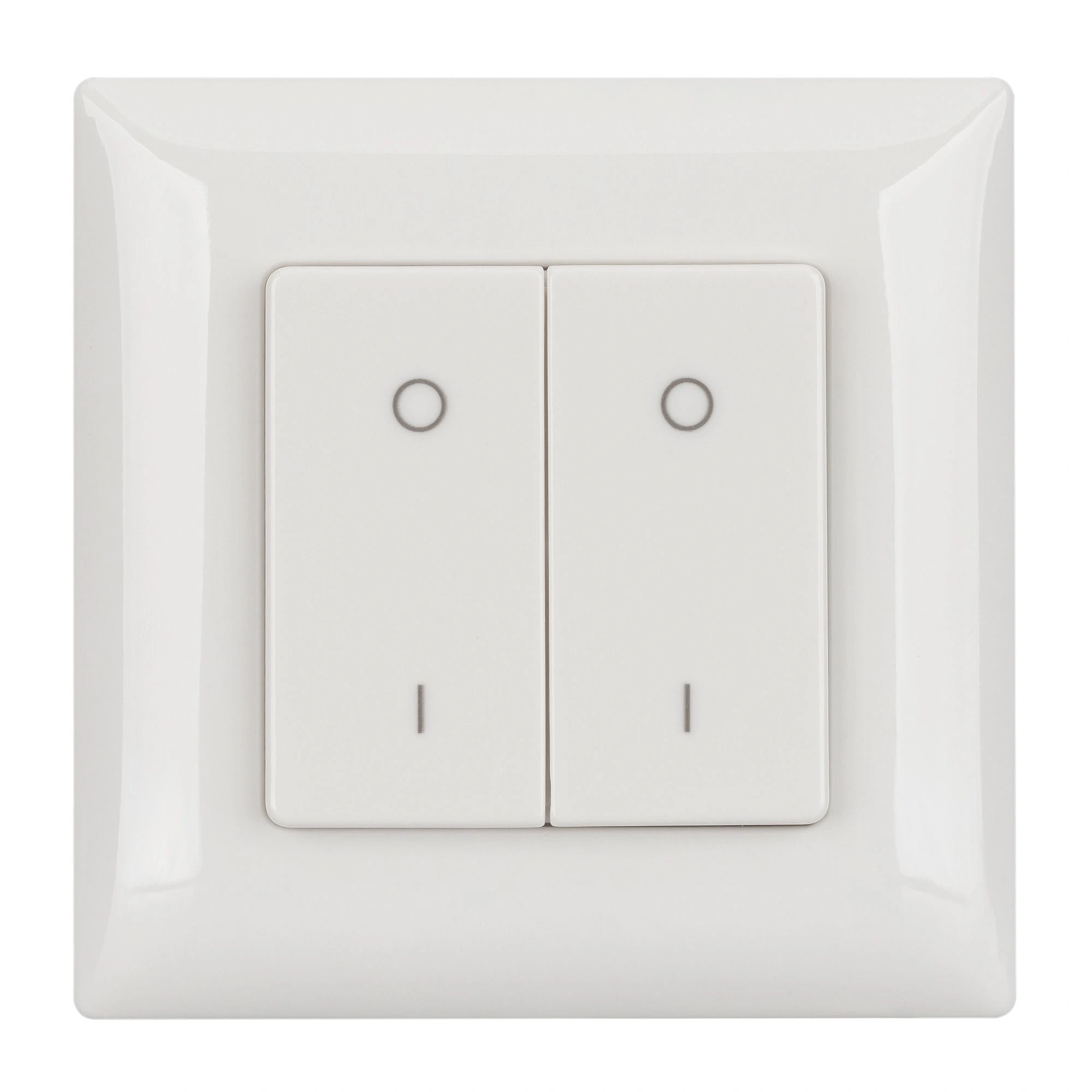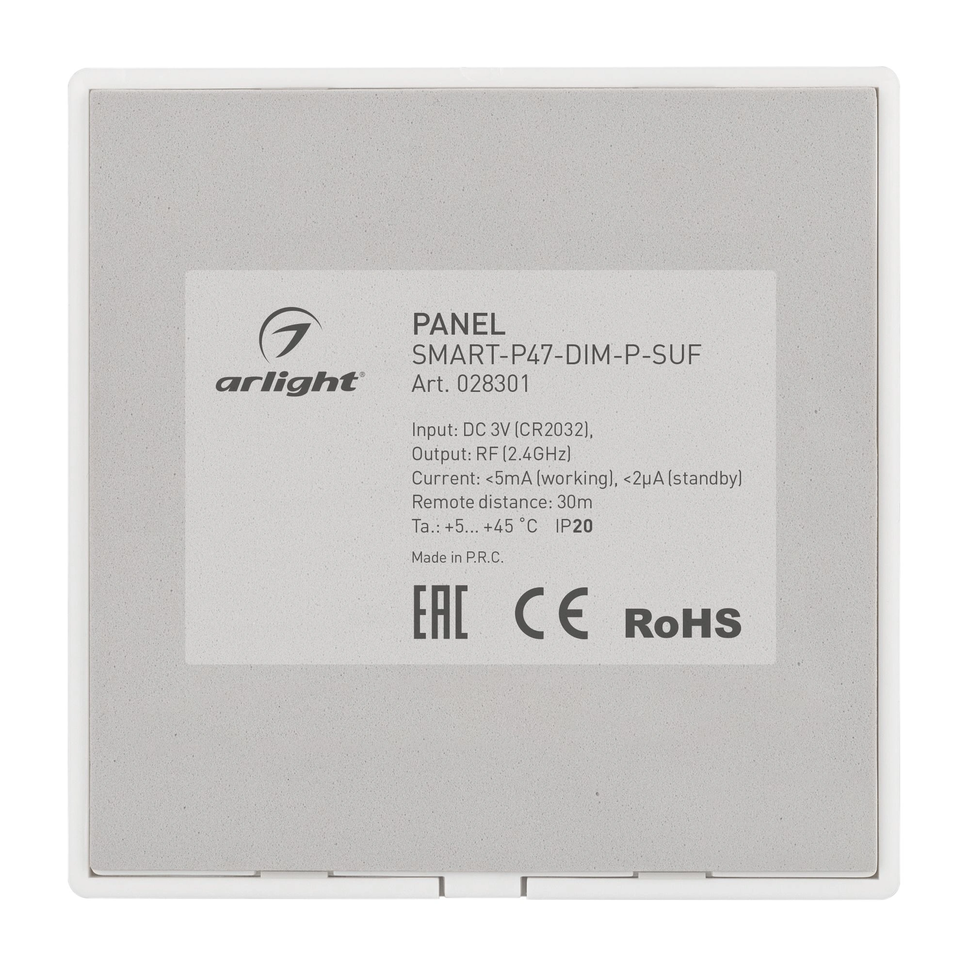 Накладная кнопочная панель белого цвета, изготовленная из пластика. Предназначена для управления одноцветными источниками света (ШИМ) с помощью кнопок. Основные выполняемые функции: включение и выключение света, регулировка яркости. Удобное и точное управление с помощью эргономичных кнопок. Изделие применяется в качестве 2-зонного пульта дистанционного управления диммерами и контроллерами серии SMART. К одной панели возможно привязать неограниченное количество диммеров и контроллеров. Устройство совместимо с диммерами и контроллерами серии SMART, поддерживающими управление по радиоканалу 2.4G. Питание 3В осуществляется от батарейки CR2032. Габариты панели 86х86х14 мм, корпус выполнен из пластика, лицевая часть - из пластика. Устройство устанавливается на любую поверхность, к которой возможно прикрутить монтажную базу панели.